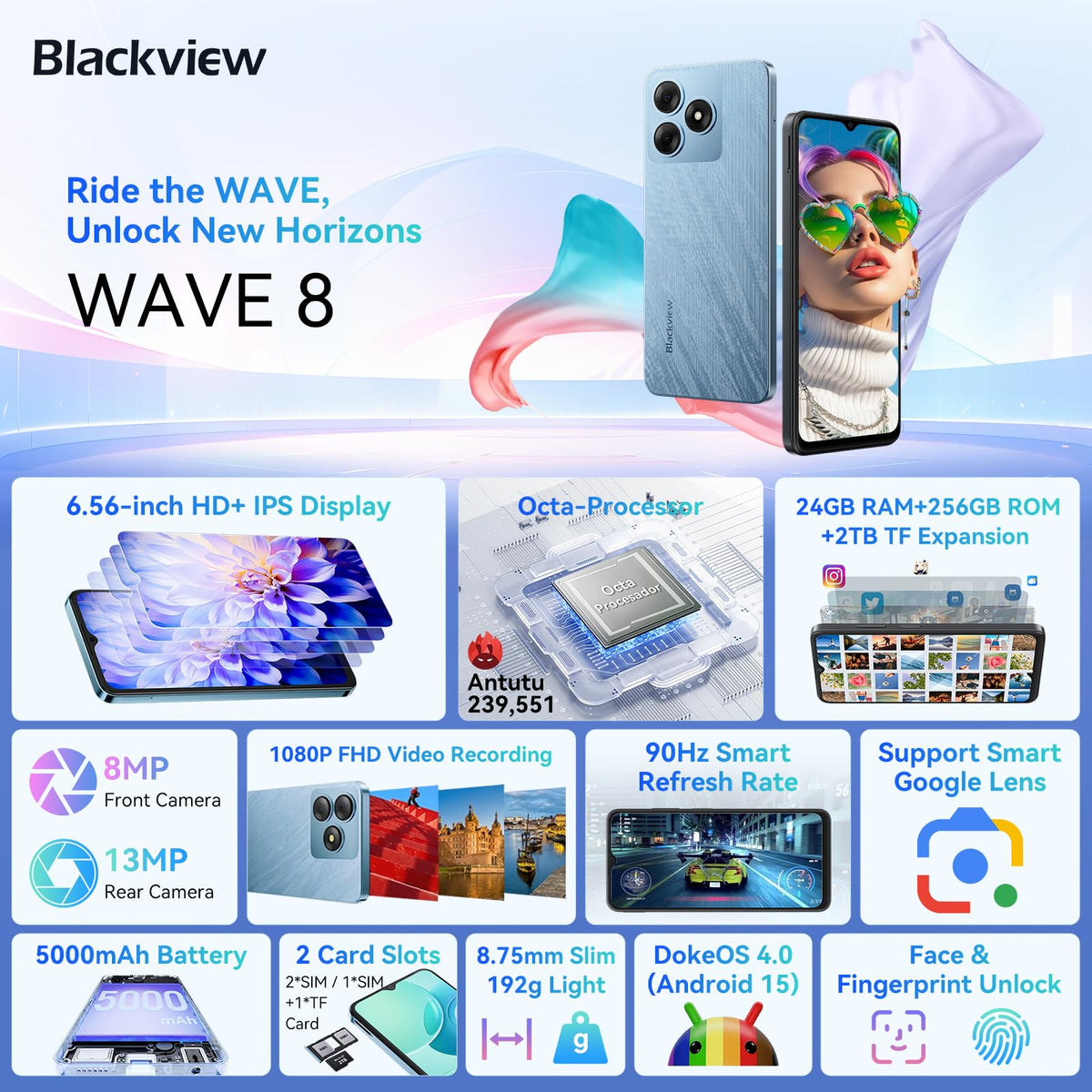 Introducing The Blackview Wave8, An Unlocked Android 15 Smartphone Offering A Versatile Experience With 24Gb + 256Gb Storage Expandable Up To 1Tb. Featuring A 6.56'' Hd+ Display And Powered By An Octa-Core Processor, It Delivers Smooth Performance For Everyday Tasks And Entertainment. The 5000Mah Battery Ensures All-Day Usage, Supported By 4G Connectivity And Dual Sim Functionality. Enhanced Security Comes Via Ai Face And Fingerprint Unlock. Additional Conveniences Include Otg Support, A 3.5Mm Headphone Jack, And Gps For Navigation. Whether For Work Or Play, The Blackview Wave8 Combines Reliable Performance With Essential Features To Meet Your Mobile Needs.