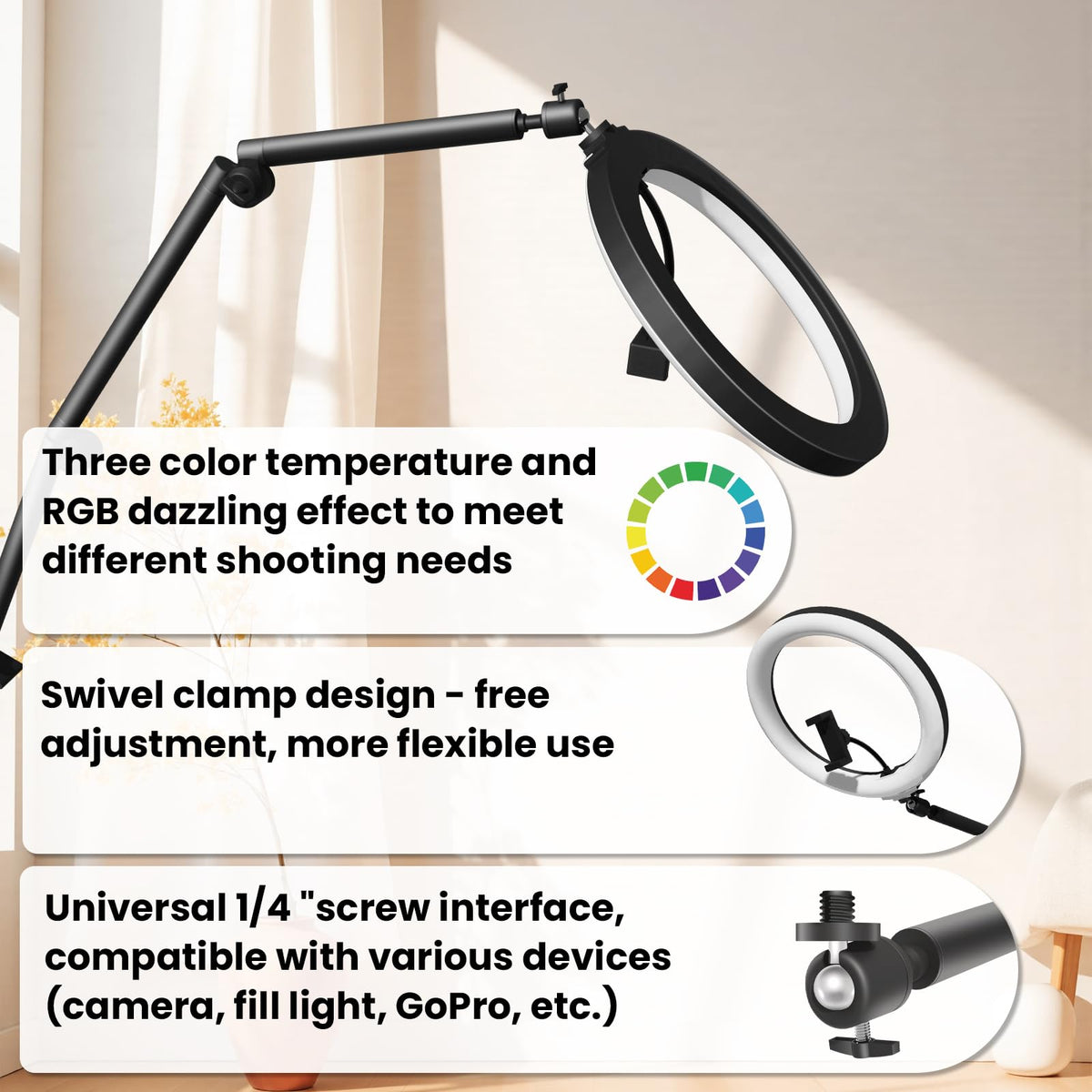 Professional 12'' Rgb Desk Ring Light With Heavy-Duty 3-Section Knob Mount - Unleash Your Creativity Transform Your Content Creation With Our Premium 12-Inch Rgb Ring Light For Desk That Combines Professional-Grade Lighting With A Rock-Solid Overhead Camera Mount. Designed Specifically For Content Creators Who Demand Both Stability And Creative Lighting Options. Product Features: 1. Professional Rgb Lighting System: - Standard Lighting Modes: 3 Classic Color Temperatures (3000K-6500K Warm/Natural/Cool White) - 10 Brightness Levels For Each Lighting Mode - Wide 12'' Diameter Provides Even Illumination And Professional Catch Lights 2. Industrial-Grade Stability System: - Heavy-Duty 3-Section Adjustable Arm With Precision Locking Knobs At Each Joint - Reinforced Metal Construction Designed To Hold The 12'' Ring Light Without Sagging - Anti-Slip Rubber Pads On All Contact Points Prevent Desk Scratching And Unwanted Movement - Supports Extended Use Without Loosening Or Drooping 3. Smart Control Options: - User-Friendly Smartphone App For Complete Lighting Control - Save Custom Color Settings And Scenes For Consistent Content - Music Sync Mode That Reacts To Ambient Sounds Or Music In Your Videos - Timer Function For Automated Lighting Changes During Recording 4. Advanced Phone Mounting System: - Reinforced Spring-Loaded Phone Grip With Silicon Padding - Double-Locking Mechanism Prevents Accidental Drops - Supports Smartphones Up To 3.7'' Wide (Compatible With All Modern Smartphones) - 360 Ball-Head Rotation For Precise Angle Adjustments 5. Versatile Content Creation Applications: - Gaming Streams With Matching Rgb Colors To Your Gaming Setup - Tiktok Videos With Dynamic Color Changes And Effects - Product Photography With Custom Color Backdrops - Makeup Tutorials With Accurate Color Representation - Virtual Meetings With Professional Lighting Package Includes: - 1 X 12'' Rgb Professional Desk Ring Light - 1 X Overhead Mount - 1 X Phone Holder - 1 X User Manual&Nbsp; Technical Specifications: - Light Diameter: 12 Inches (30.5Cm) - White Color Temperature: 3000K-6500K - Power Input: Usb-C 5V/2A - Weight Capacity: Supports Phones Up To 14Oz (400G) - Clamp Opening: Fits Desks Up To 2.5'' Thick Instructions For Use: 1. Securely Attach The Clamp To Your Desk Or Table Edge 2. Adjust The Arm To Your Desired Position Using The Locking Knobs 3. Connect The Usb-C Power Cable To A Power Source 4. Download The Control App By Scanning The Qr Code 5. Secure Your Smartphone In The Phone Holder 6. Use The App Or Touch Controls To Select Your Desired Lighting Effects Elevate Your Content Creation With Professional Rgb Lighting And Unmatched Stability. Express Your Creativity With Unlimited Color Possibilities While Enjoying Rock-Solid Performance! Kindly Note: Power Adapter Not Included. For Optimal Performance, Use With A 5V/2A Or Higher Power Adapter.