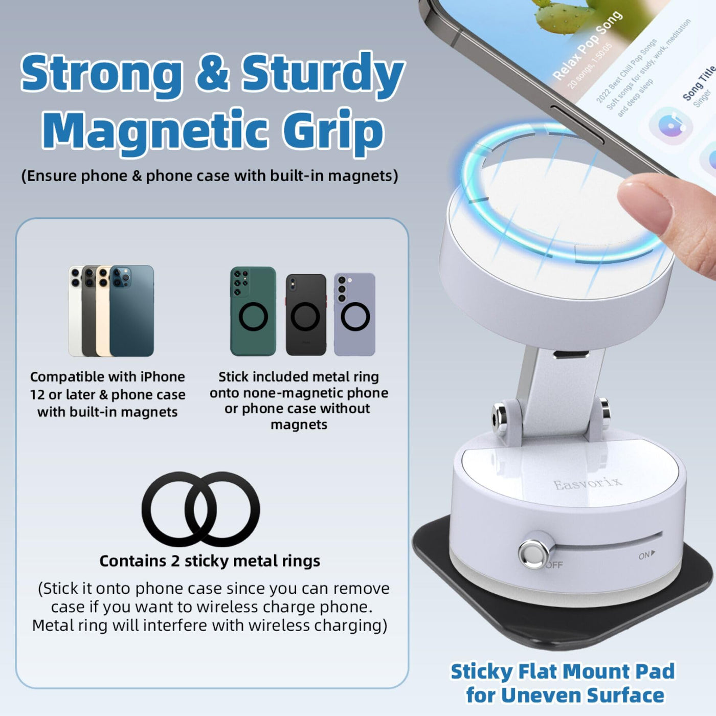 Upgrade Your Mobile Experience With Easvorix Innovative Dual-Sided Magnetic Vacuum Phone Stand, Designed For Ultimate Convenience And Versatility. Featuring A Strong Magnetic Mount And A Vacuum Suction Cup, Easvorix Cell Phone Stand Securely Holds Your Device In Place. Adhesive Metal Rings For Phone Case, Solid Magnetic Grip Compatible With Iphone, Android Works Seamlessly With Iphone 16, 15, 14, 13, 12 Series, Samsung, Google Pixel And All Smartphones. Adhesive Metal Ring Is Included For All Flat Phone Case And Make It Magnetically Attached. The Surface Of The Phone Magnetic Holder Is Covered With Silicone, Protecting Your Phone From Scratches. Note: Before Wireless Charging Phone, Remove Phone Case With Metal Ring Which Interferes With Wireless Charge. Adhesive Pad For Uneven Surface, Super Strong Windshield Suction Cup Features A Reinforced Vacuum Suction Cup With Easy & Quick Lock. Ensure Surface Is Glossy Or Smooth. If Not Work, Stick Included Mounting Pad On Surface And It Wont Fall Off. Note: Choose Right Spot First Since Mount Pad Is Very Sticky & Hard To Remove. Adjustable Viewing Angle 3.2In Stretchable & Telescopic Arm And Multi-Angle Adjustment Allow For A Fully Customizable Viewing Position, Making It Perfect For Watching Videos, Navigating, Video Calls. Collapsible For Easy Carry Foldable, Portable And Travel-Friendly, Fold Into Itself To Be More Compact When Not In Use. Easvorix Vacuum Magnetic Phone Stand Is Ideal For Home, Office, Kitchen Or Car Use. Must-Have Phone Accessory, Perfect All-In-One Mobile Stand For Your Daily Needs! Specifications: Material: Abs, Tpe, Magnets Rotation: Adjustable For Optimal Viewing Angles Universal Compatibility: All Smart Phone, Stick Included Adhesive Metal Ring Onto Phone Case And Make It Magnetically Attractable Mount Type: Magnetic Attachment To Phone Or Phone Case With Built-In Magnets, Iron, Nickel, Cobalt, Ferromagnetic-Coated Surfaces, Such As Metal Gym Equipment. If Not Work, Stick Included Metal Ring Onto Surface & Make It Magnetically Attached. Suction Cup Adhesion To Smooth Surface, Such As Car Wind Windshield, Mirror, Tiles, Acrylic, Polished Glass. If Not Work, Stick Included Pad On Surface & Make It Smooth. Package 1 Easvorix Vacuum Magnetic Cell Phone Automobile Cradle 2 Sticky Metal Rings For Phone Case 1 Adhesive Flat Mounting Pad For Uneven Surface Cleaning Wipe Wrench To Tighten The Hinge