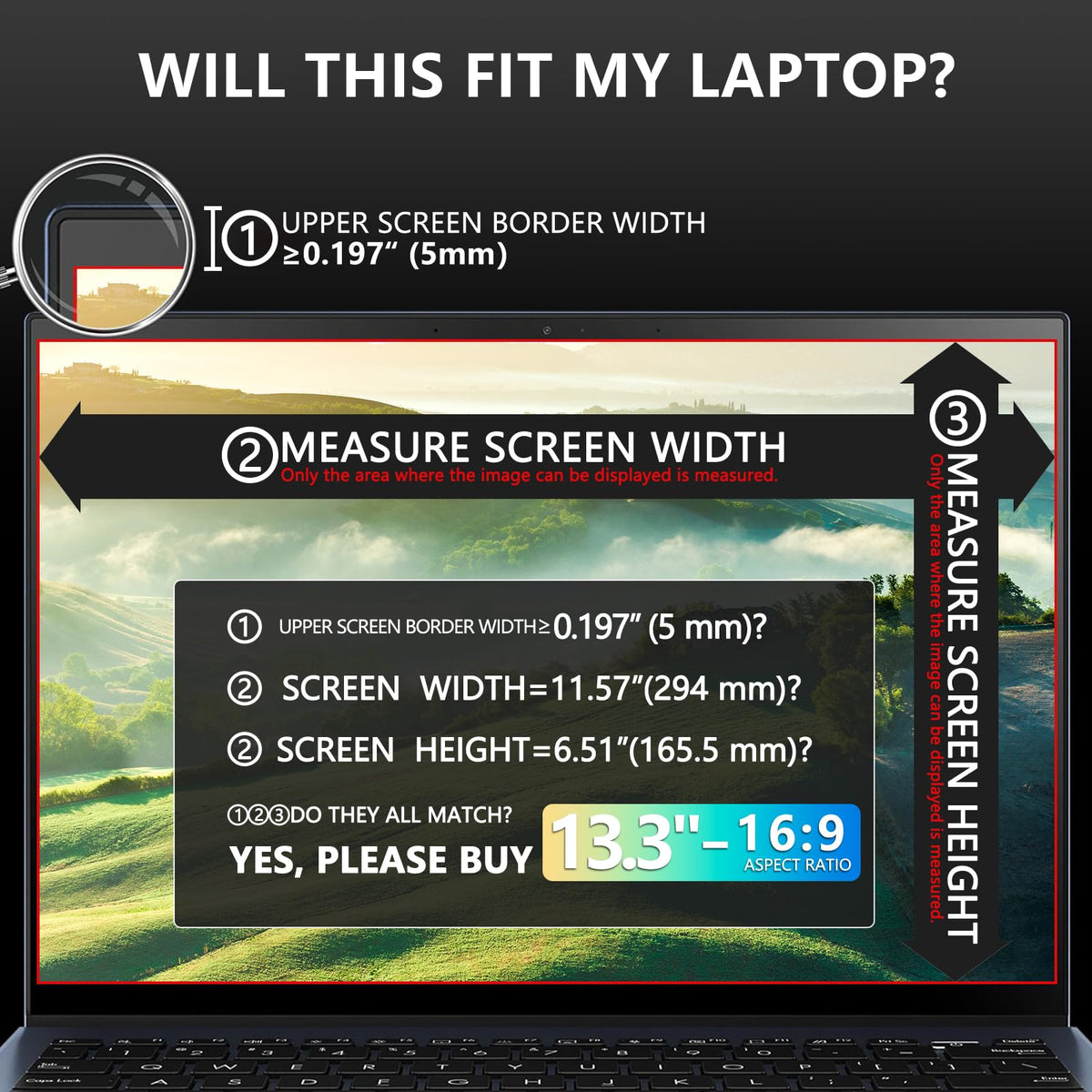 [Anti-Peeping Artifact-Laptop Privacy Screen] Laptop Privacy Screen For 13.3 Inch 16:9 Narrows The Field Of Vision To 30 Degrees 5,Nobody Can Steal Your Privacy Without Your Consent.Higher Clarity Than Other Market Laptop Privacy Screen Filter, So The Screen Data Is Clearly Visible To The People In Front Of The Screen. Viewing From Side Shows A Dark And Unclear Screen. [Removable Magnetic Laptop Privacy Screen] Laptop Privacy Screen Adopt Detachable Magnetic Design,Easy To Install And Detachable,Switch Between Anti-Peep And Original Screen Vision At Any Time. We Also Provide Screen Protector Storage Folder For Laptop Privacy Filter,Which Can Be Easy To Carry And Use At Any Time.[13.3 Inch Laptop Privacy Screens-16:9 Is Suitable For A Variety Of Public Places, Business Meetings, Open-Style Offices, Financial Institutions, Cafes, Airplanes, Trains Etc.] [With Matte Finish & Glossy Finish] 13.3 Inch Laptop Privacy Screen Protector With Matte Finish And Glossy Finish In All One, The Matte Finish Side Of Laptop Privacy Screen In Addition To The Anti-Spy, It Also Has Excellent Anti-Glare And Anti Fingerprints Function. The Glossy Finish Side Of Laptop Privacy Filter Present A Clearer Picture. And Better Privacy Function, Also Both Matte And Glossy Finish Can Block 35% Blue Light To Protect Your Eyes. [Please Measure Length & Width] Filmext Magnetic Privacy Filter For Laptop 13.3 Inch 16:9-Ratio Width: 11 9/16'' (294 Mm ), Height: 6 1/2''(166 Mm), Diagonal: 13.3 Inch 16:9 Ratio (Universal-13.3''16:9, Not For Macbook) Please Confirm Width And Height For Your Laptop Screen Before Ordering And Feel Free To Contact Us If You Have Any Questions About The Size. [What'S In Box]: Filmext Magnetic Laptop Privacy Screen 13.3 Inch-Aspect Ratio 16:9 X1, Upgraded Soft Long Single Sided Adhesive Magnet X 2 Pair, Laptop Screen Protector Storage Folder X1, Screen Cleaning Kit X1, Long Double-Side Washable Adhesive Stripe X 4 Pair. Filmext Is A Factory That Integrates Production, Processing And Sales, And We Are Committed To Making You More Satisfied. Buy With Confidence.[7*24 Online Service And Support]