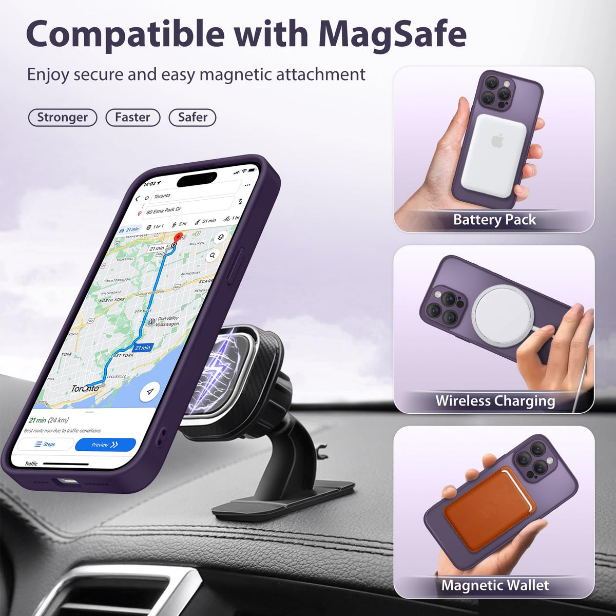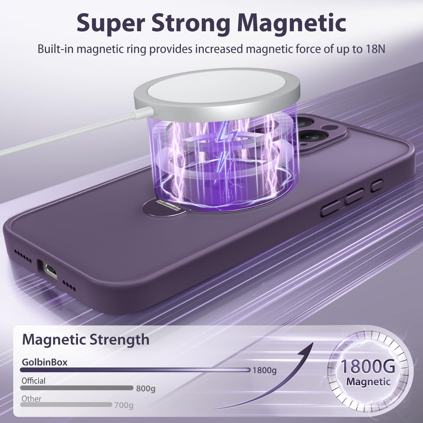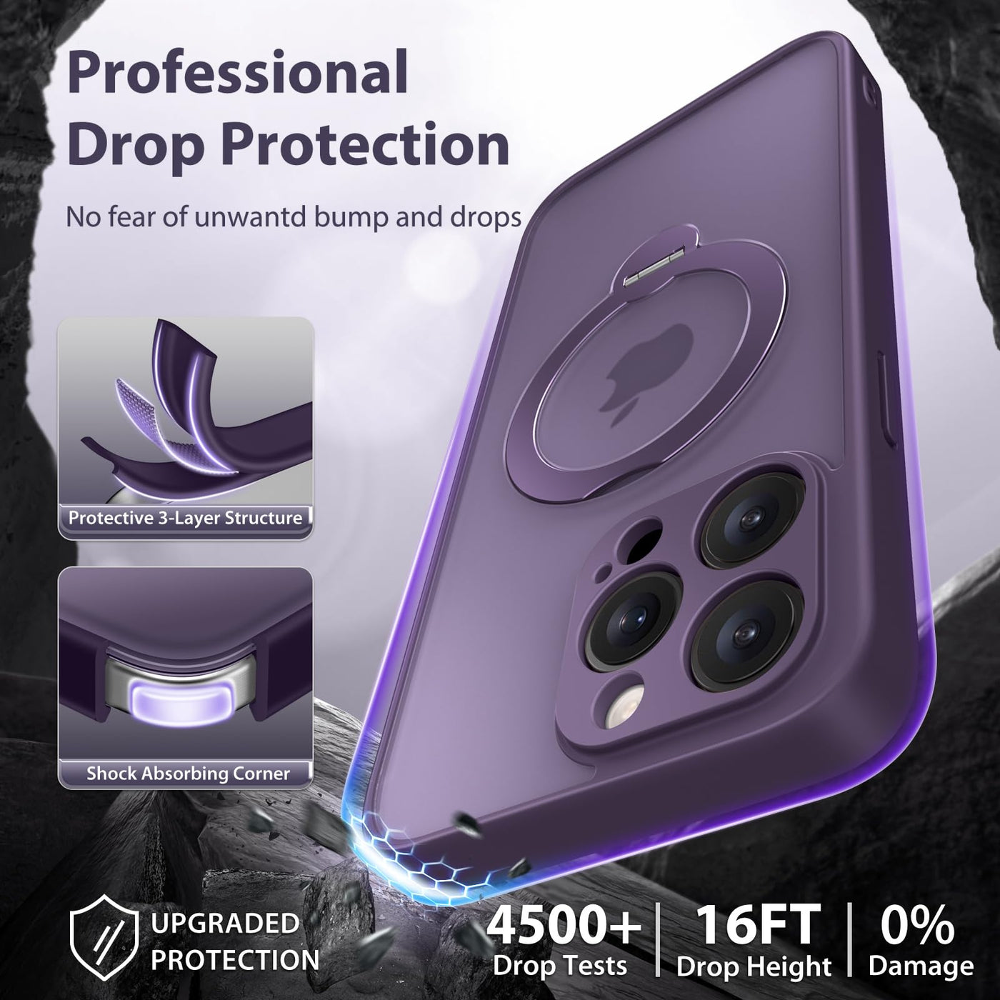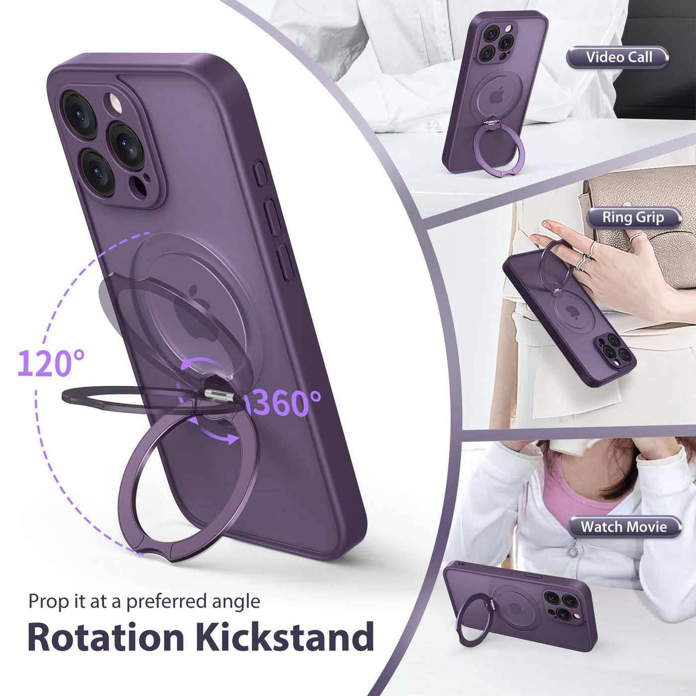 Golbinbox 360 Spin Magnetic Stand For Iphone 15 Pro Max Case, [Compatible With Magsafe], [Full Camera Protection] [16Ft Military Drop Protection], Slim Translucent Matte Phone Case, Deep Purple