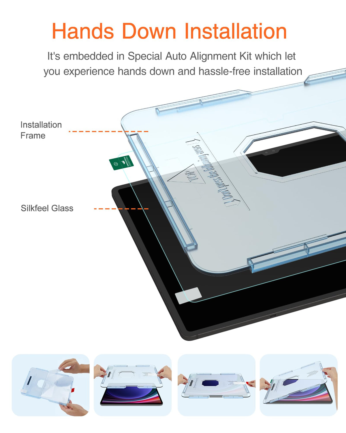 The Screen Surface Is Processed Using The Latest Etching Technology, Making The Screen Protector Feel As Soft And Responsive As Silk. At The Same Time, It Reduces The Flash Point Of The Screen, The Reflection Of Light And Softens The Light Of The Screen To Reduces The Impact Of Strong Light On The Visibility Of The Screen.Makes Your Screen Clearer Under The Light. The Upgraded Self-Aligning Mounting Bracket Can Automatically Align The Screen And Eliminate The Trouble Of Aligning The Screen. The Automatic Exhaust System Can Automatically Exhaust To Reduce The Generation Of Air Bubbles And Allow The Film To Be Automatically Adsorbed On The Surface Of The Screen, Making The Installation Process Easier And More Convenient.High-Quality Tempered Glass Can Well Protect The Screen, Relieve The Impact Of Heavy Objects, And Prevent Scratches Caused By Scratches From Hard Objects. The Hydrophobic And Oleophobic Layer Can Reduce The Residue Of Fingerprints, And The Surface Can Be Cleaned Quickly And Cleanly. Compatible With Samsung Galaxy Tab S10 Ultra /S9 Ultra And Tab S8 Ultra 14.6 Inch 2024/2023/2022