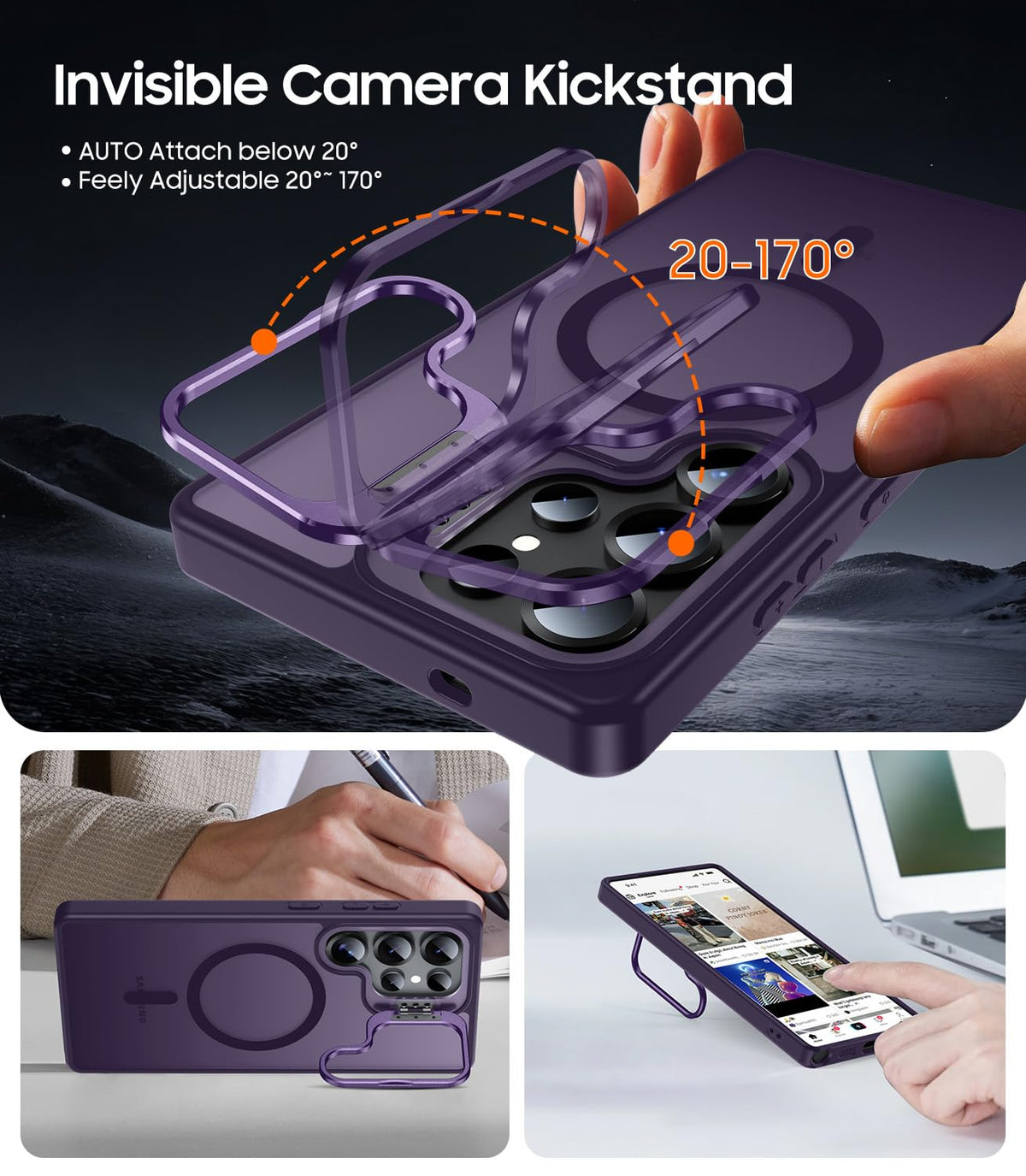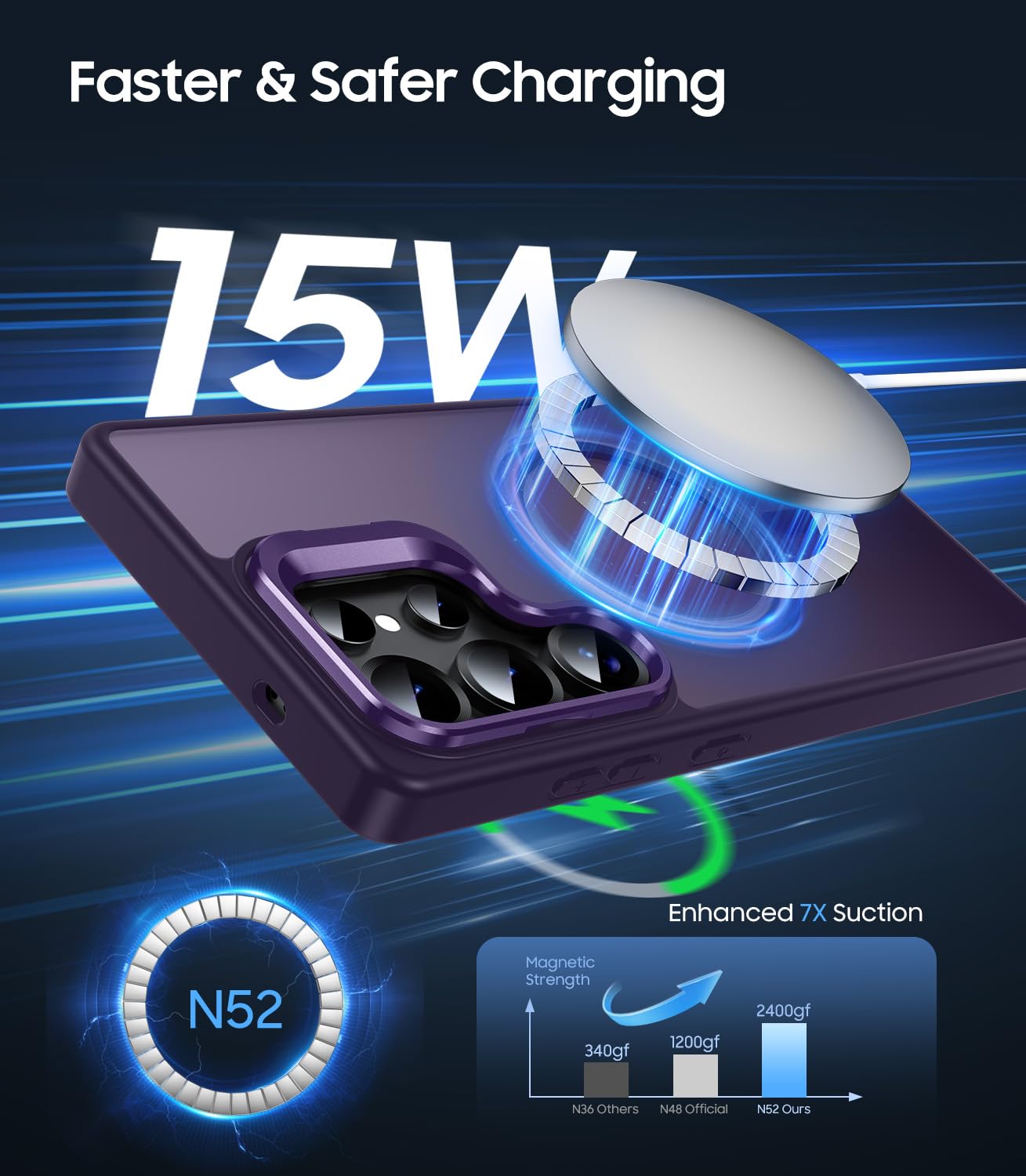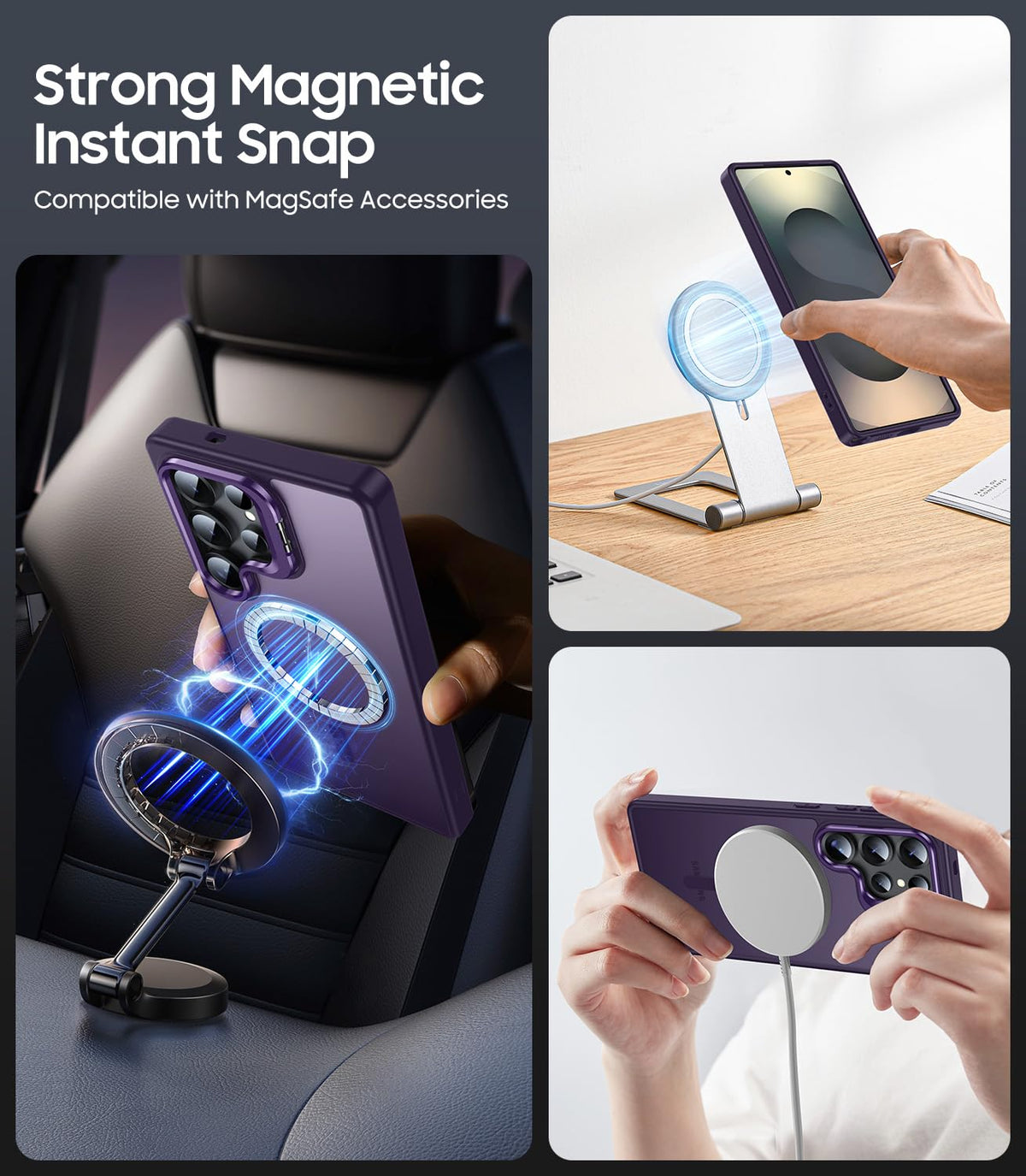 Compatible Model: Compatible With Samsung Galaxy S25 Ultra (2025 Released) 1. Quick Charging Speed, Built-In Strong 38 Pcs N52 Magnets Ring Structure Brings You The Original 20W Quick Charging Experience. 2. The Hidden Lens Holder, Screen Protector And Raised Lens Protection Frame Provide Multiple Protections For Lens And Screen. 3. Flip The Hidden Camera Stand And The Lens.Frees Your Hands To Watch Videos And Movies At Their Best Horizontal Angles. 4. The Precise Cutouts Ensure Unobstructed Operation, And Dust Is Difficult To Enter The Speaker Holes. 5. The High-Quality Pc Back Panel Material And Tpu Frame Designed With Cushioning Airbags Provide Comprehensive Protection For The Phone Against Daily Drops And Scratches.