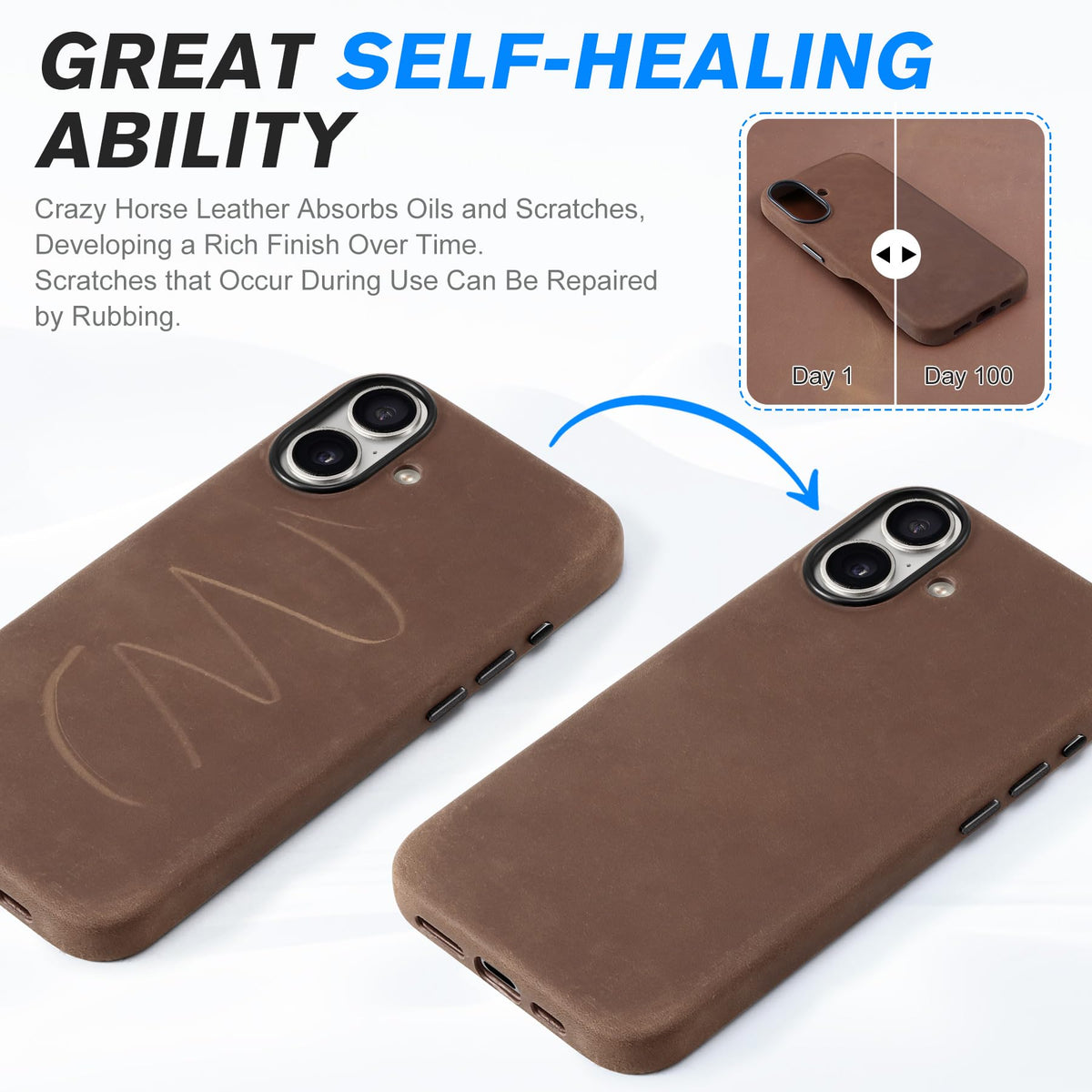 Shieldon Case For Iphone 16 Plus 5G, Top Grain Crazy Horse Leather Magnetic Wireless Charging Anti-Scratch Non-Slip Shockproof C