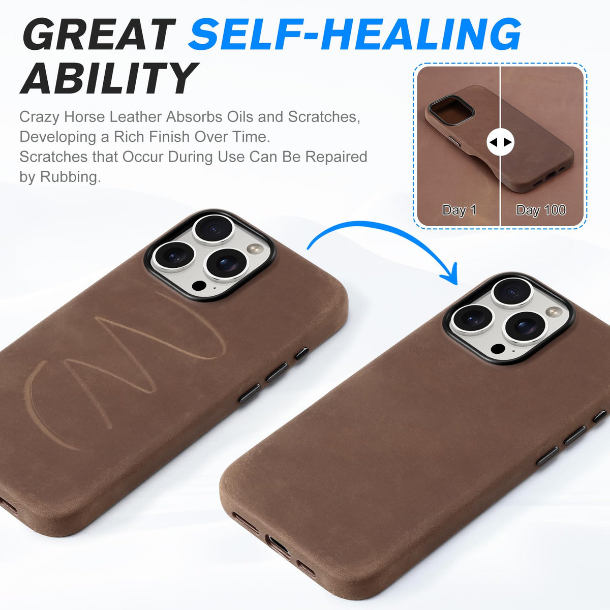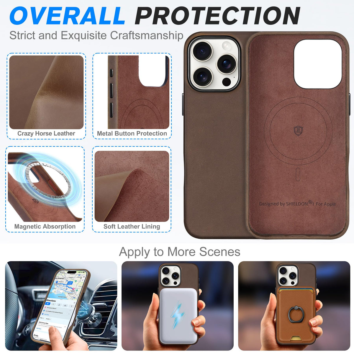 Shieldon Case For Iphone 16 Pro 6.3'', Top Grain Crazy Horse Leather Magnetic Wireless Charging Anti-Scratch Non-Slip Protective