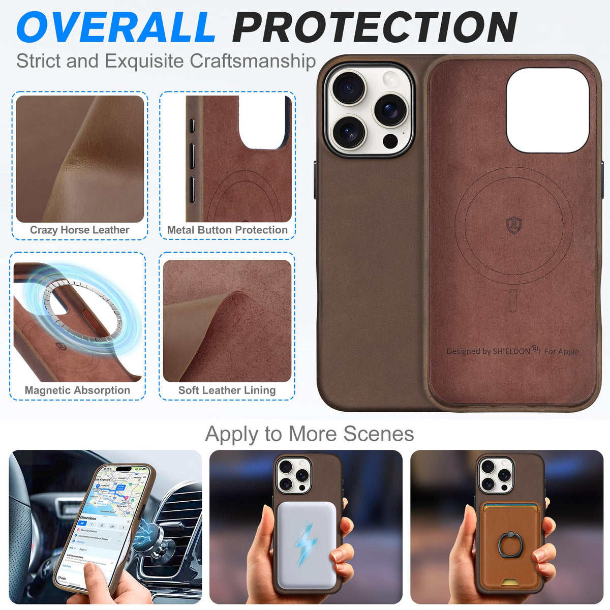 Shieldon Case For Iphone 16 Pro Max 6.9'' 5G, Top Grain Crazy Horse Leather Magnetic Wireless Charging Anti-Scratch Non-Slip Cas