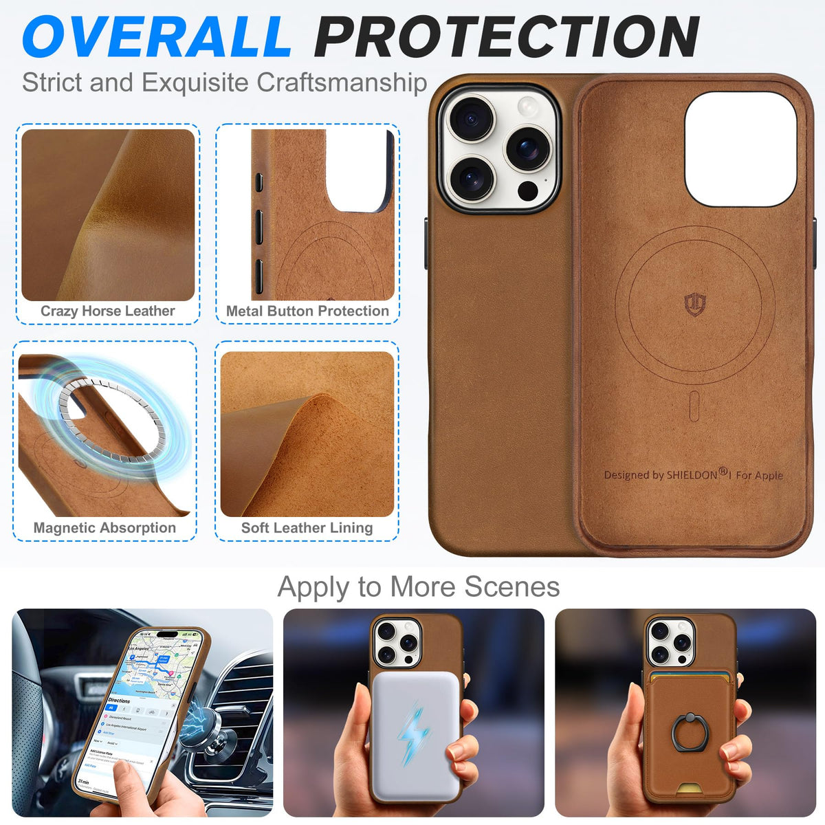 Shieldon Leather Case For Iphone 16 Pro 6.3'', Top Grain Crazy Horse Leather Magnetic Wireless Charging Non-Slip Shock-Absorbent