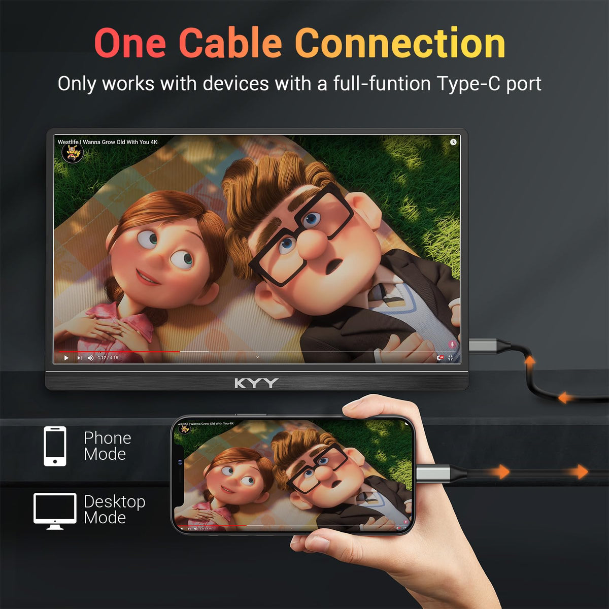 Kyy 15.6Inch Full Hd Portable Monitor Why Choose This Portable Monitor? Travel Ready With Only 1.7Lb And 0.3 Inches Slim Profile, The Kyy Portable Display Is Easy To Put Into Your Briefcases And Become The Ideal Travel Companion For Laptops To Maximize Work Efficiency. More Connectivity Choice Equipped With Mini Hdmi And Dual Usb Type-C Ports, Kyy Is Compatible With Your Laptops, Pcs, Phones, Ps3/4, Xbox One, Wii, Or Nintendo Switch, Etc, Allows You To Plug And Play In Second. Real Pics On Your Eyes Features 85% Colour Gamut, 300Cd/M Brightness And Contrast Ratio: 1000: 1, Shows You A More Real, And Awesome Viewing Experience When Screen-Sharing, Images Or Video Editing, Watching Movie, And Gaming. Equipped With Advanced Smart Cover An Upgraded Magnetic Smart Case Is Made Of Advanced Pu Material, Which Is Slip-Proof, Scratch-Proof, Waterproof, And Dustproof, Double As A Foldable Smart Stand, Allows You Freely To Adjust The Comfortable Viewing Angle. Specifications Panel Type: Ips Lcd Resolution: 1920*1080 Colour Gamut: 85% Contrast Ratio: 1000: 1 Color Temperature: 6800K Brightness: 300Cd/M Aspect Ratio: 16:9 Display Color: 16.7M Speaker: Built-In Speaker (1W*2) Output Interface: 3.5Mm Headphone Interface Input Interface: Mini Hd(Video Signal), Type-C Full Function (Video Data, Power Supply), Type-C Power Supply System Requirement: Devices With Hd Output Interface. Computers Or Mobile Phones With Type-C Fully Functional Port Just In Case 1. Phones That Do Not Have A Full-Featured Type C Port Require An Adapter To Connect. 2. Please Check If The Type-C Port Of Your Laptop Is A Full-Featured Type C Port, If Not, It Would Not Work With Kyy.(You Can Connect The Monitor With Hdmi Cable And Type-C Power Supply Cable.)