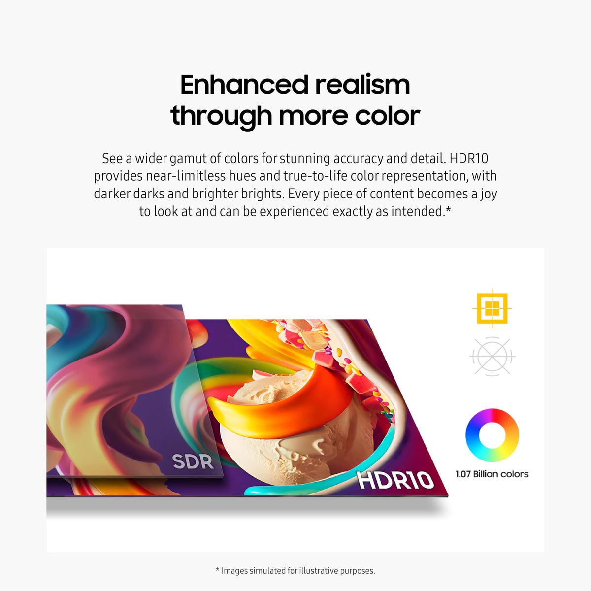 Samsungs S60D Viewfinity Monitor With 2560 X 1440 Qhd Resolution And 100Hz Refresh Rate Delivers The Crystal-Clear Visuals Demanded By Designers And Creators Everywhere. Requiring No Tools Or Screws, The Easy Setup Stand Offers Simple Assembly With Just The Push Of A Button. With 1.07 Billion Colors, Hdr10 Provides Near-Limitless Hues And True-To-Life Color Representation To View Your Content With Deeper Contrast For Darker Darks And Brighter Brights. Multiple Ports Enable Convenient Connectivity That Simplify Setup And Enhance Productivity. The Height-Adjustable Screen Tilts And Pivots For The Best Angles And Ultimate Utility. Tv-Certified Intelligent Eye Care And Eye Saver Mode Reduces Screen Flickering And Protects Eyes Against Excessive Blue Light.Images Simulated For Illustrative Purposes.