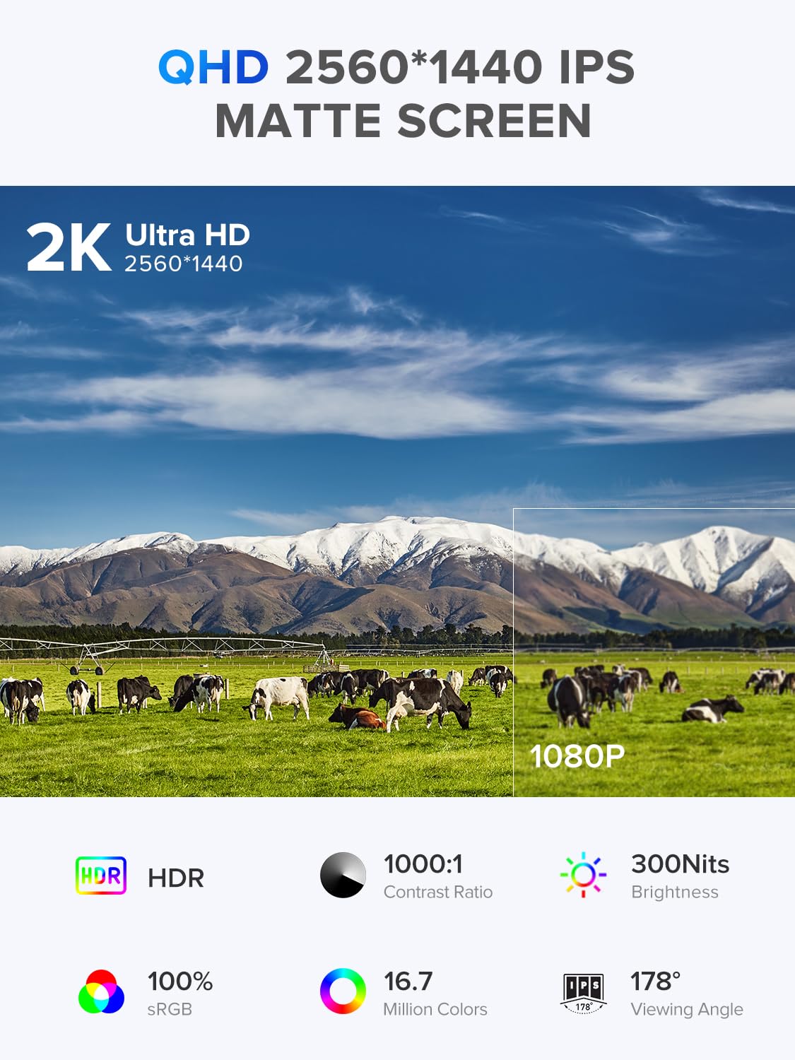 Uperfect 22'' 2K Portable Monitor W/Vesa & 180Adjustable Stand, 2560 * 1440 Qhd Freesync Ips Hdr Large Gaming Display, Usb C Hdm