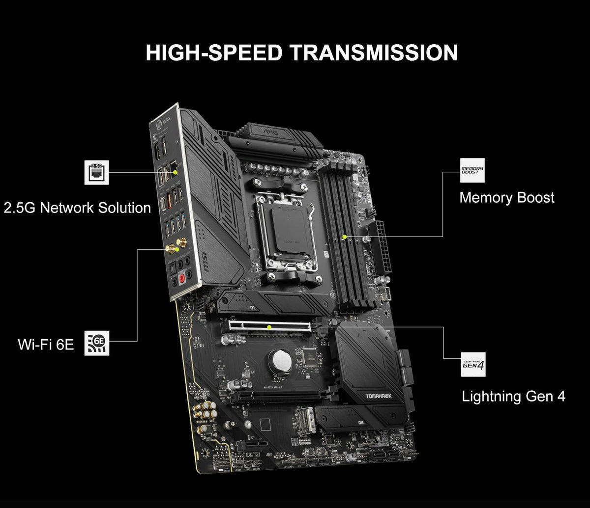 Amd Ryzen 7 7800X3D Desktop Processor, 8 Cores, 16 Threads, 5.0 Ghz Max Boost, Unlocked Memory Overclocking. L2+L3 Cache 104 Mb, 120W Tdp,128Gb Ddr5-5200 Memory Supported. For The State-Of-The-Art Socket Am5 Platform,Can Support Pcie 5.0 On Select 600 Series Motherboards | Amd Ryzen 7 7800X3D Processor Features Amd 3D V-Cache Technology Delivers Absolute Gaming Performance That Exceeds The Highest Expectations. Amd Radeon Graphics Integrated, Cooler Not Included, Liquid Cooler Recommended. Support Windows 10/ 11- 64-Bit Edition | Msi Mag B650 Tomahawk Wifi Gaming Motherboard, Atx Form Factor, 4X Ddr5, Dual Channel Maximum Memory Capacity 192Gb, Pcie 4.0 Support, 3X Key M (Pcie)+1X Key E (Wifi/Bt), Supports Up To Pcie 4.0 X4, 6X Sata 6Gb/S Ports, 3X Usb 3.2 Gen 2 10Gbps Type-A Ports, 1X Usb 3.2 Gen 2X2 20Gbps Type-C Port, Wi-Fi 6E, Supports Bluetooth 5.2, Windows 11 Supported, Supports Amd Ryzen 8000/ 7000 Series Desktop Processors | Supports Ddr5 Memory, Up To 7600+(Oc) Mhz;/ Premium Thermal Solution: Extended Heatsink Design And M.2 Shield Frozr Are Built For High Performance System And Non-Stop Works;/ 2.5G Lan And Amd Wi-Fi 6E Solution: Upgraded Network Solution For Professional And Multimedia Use. Delivers A Secure, Stable And Fast Network Connection | Lightning M.2: Running At Pcie Gen 4 Maximizes Performance For Nvme Based Ssds;/ Lightning Usb 20G: Built-In Usb 3.2 Gen 2X2 Port, Offers 20Gbps Transmission Speed, 4X Faster Than Usb 3.2 Gen 1;/ Audio Boost 5: Reward Your Ears With Studio Grade Sound Quality For The Most Immersive Gaming Experience