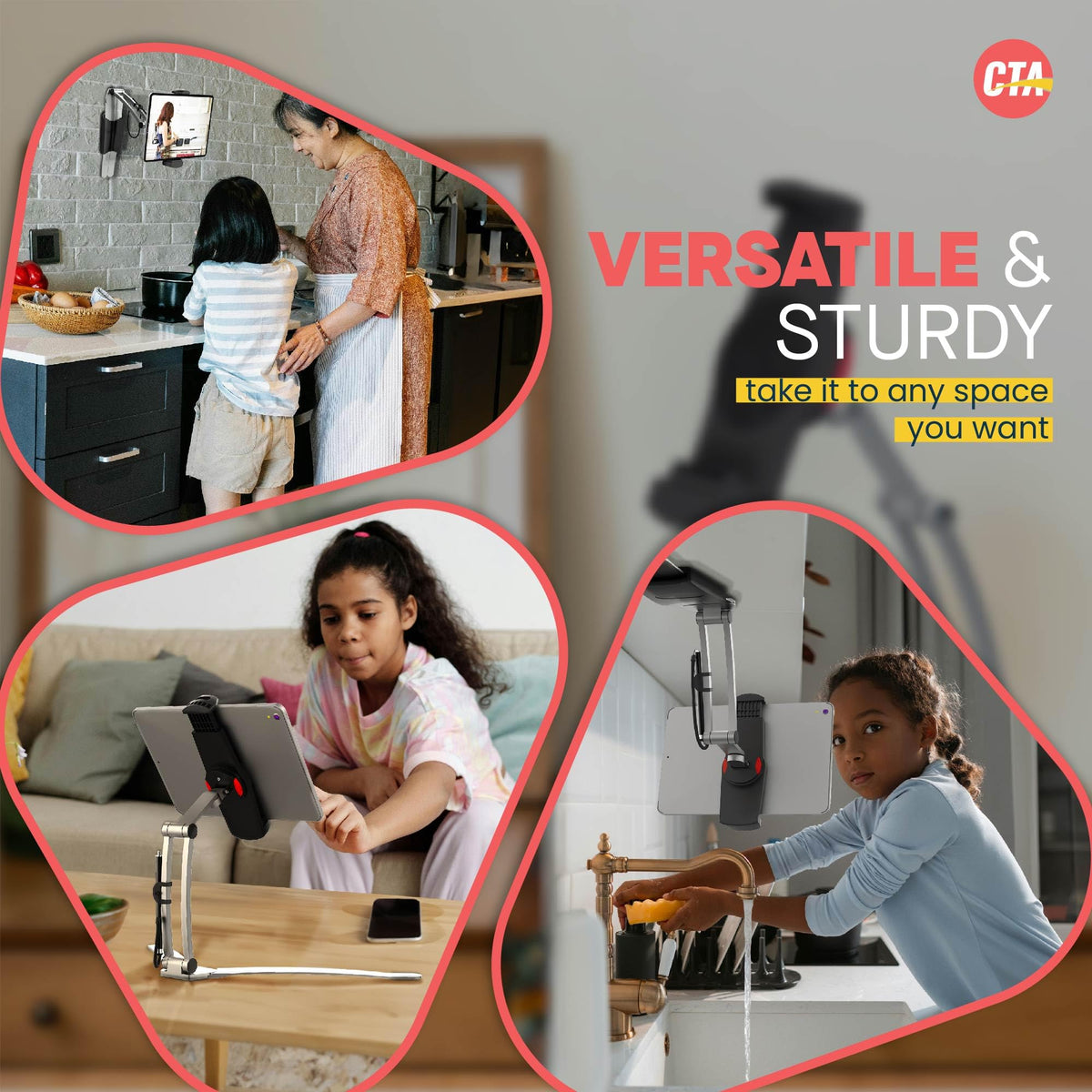 Make Your Tablet A Fixture Of Your Living Space, Work Space, And More, With Cta Digitalas Multi-Flex Tablet Stand And Mount Bundled With 2 Convenient Mount-Anywhere Bases, This Tablet Stand Easily Installs On A Wall, Under A Cabinet, Or Even Tucked Into The Seatback Pocket Of An Airplane Seat The Stand Can Also Be Displayed Upright With Its Expanding Legs On Any Tabletop Or Counter Surface It Features A 360-Degree Rotating Holder, Plus Multiple Pivoting And Rotating Joints On Its Durable Aluminum Body Quick Release Buttons Allow For Easy Tablet Insertion And Removal In The Adjustable Holder, And The Stand Folds Compact For Easy Storage And Portability Also Included Are An Elegant Stylus And Elastic Tether, Plus A Convenient Holder-Grip On The Standas Neckfeatures:A Quick Release Buttons For Fast Tablet Insertion And Removala Multiple Flexible Joints And 360 Degree Rotating Holdera Folds Compact For Easy Storage And Portabilitystylish, Lightweight Aluminum Designa 2 Mounting Bases For Easy Install On Walls Or Under Cabineta Remove From Mount Base And Unfold Legs For Quick Tabletop Setupa Elegant Stylus And Elastic Tether Plus Grip-Holder On Stand Necka Compatible With Ipad 102-Inch (7Th 8Th 9Th Generation), Ipad Air Gen 4 (2020), 129-Inch Ipad Pro (2018), 11-Inch Ipad Pro, Ipad Gen 5 (2017), Ipad Pro (97 105 129), Ipad Air, Ipad Mini, Galaxy Tab S3, And Other 7-13 Inch Tabletsa Best Use For Food Delivery And Pickup Services, Healthcare Facilities, Virtual Offices, Telehealth, Online Classes, Work From Home And Morespecificationsa Dimensions: 13A X 135A X 7Aa Weight: 126 Lbsa Holder Adjusts 5875 - 8875 Inches From Top To Bottoma Mounting Base Dimensions: 5A L X 3125A W X 075A D