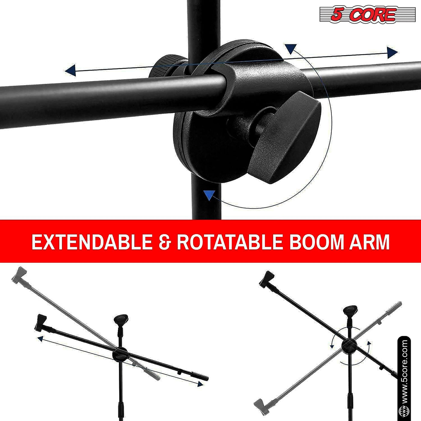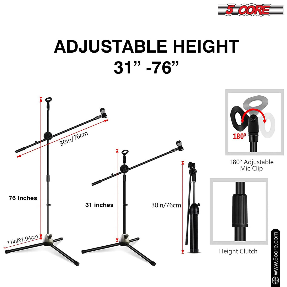 The 5 Core Mic Stand Has Adjustable Height. The Minimum Height Is 31 Inches, And The Maximum Height Is 76 Inches. The 24 Inch Boom Arm Rotates 360 Degrees For Easy Positioning, It Can Be Lowered To 2 Inches. The Tripod Leg Design Features Sturdy Metal Legs With Rubber Caps, Making It Stable Even On Uneven Surfaces. The Heavy Duty Mike Stand Has A Strong Metal Build Quality And Reinforced Clutch, Holding Up To 3.5 Lbs. This Floor Mic Stand Comes With 2 Mic Holders And 3/8 To 5/8 Screw Adapters, Fitting Most Mics And Accessories. Portable Soporte De Micr Fono, Collapsible Design, And Can Be Assembled In Minutes. Perfect For Anyone Who Needs A Reliable, Versatile Mic Stand.