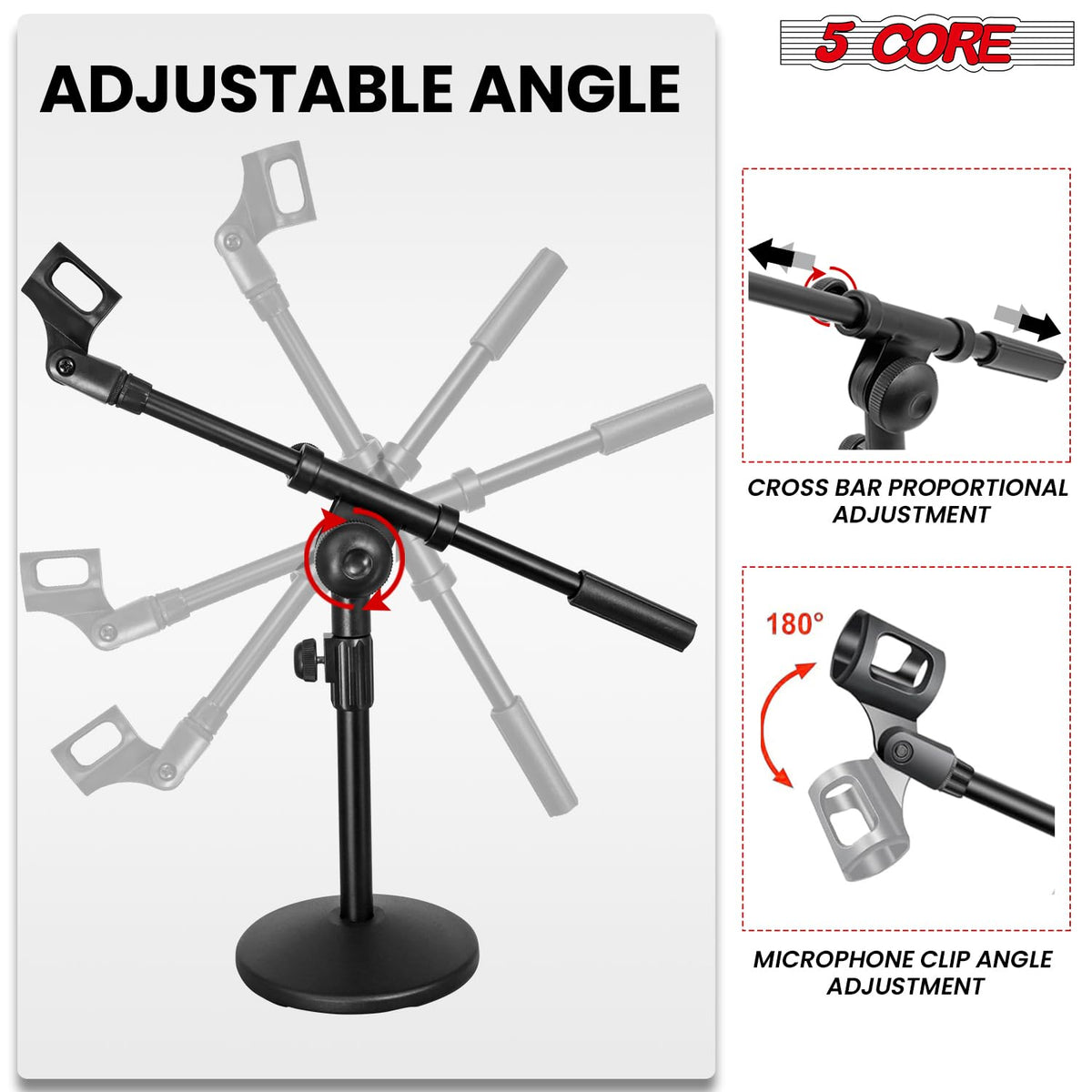 5Core Mic Stand Desk Adjustable Extendable Boom Arm Table Microphone Holder W Round Base Anti Slip Pad + Mic Clip + 3/8 & 5/8