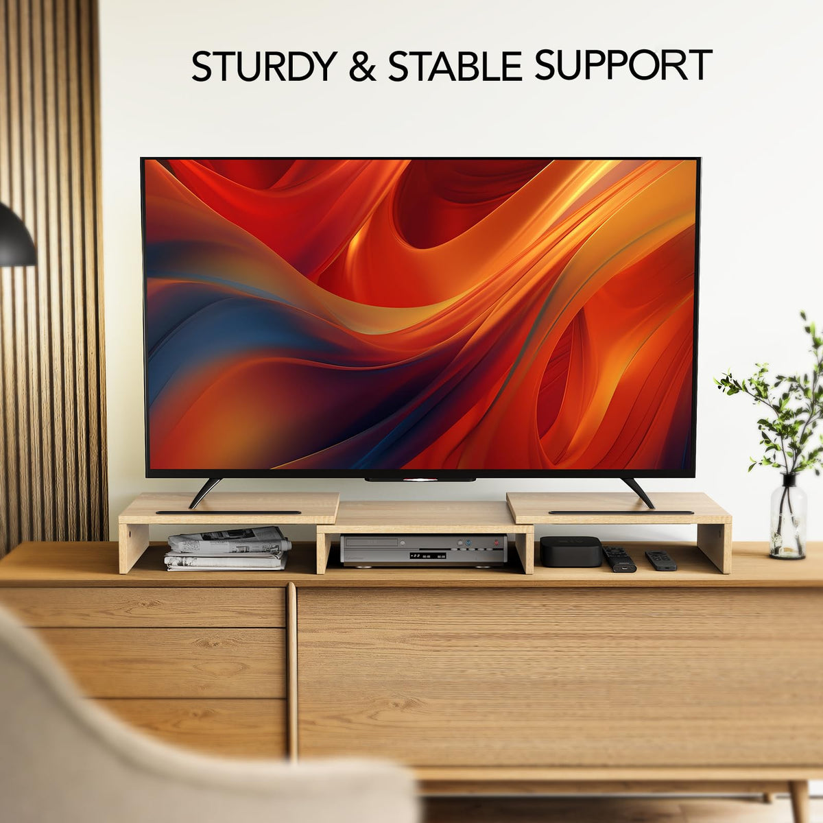 Dual Monitor Stand Riser- 3 Shelf Screen Stand With Adjustable Length And Angle, 2 Extra Functional Slot Desktop Organizer Stand Riser For Pc, Computer, Laptop. (Light Wood)