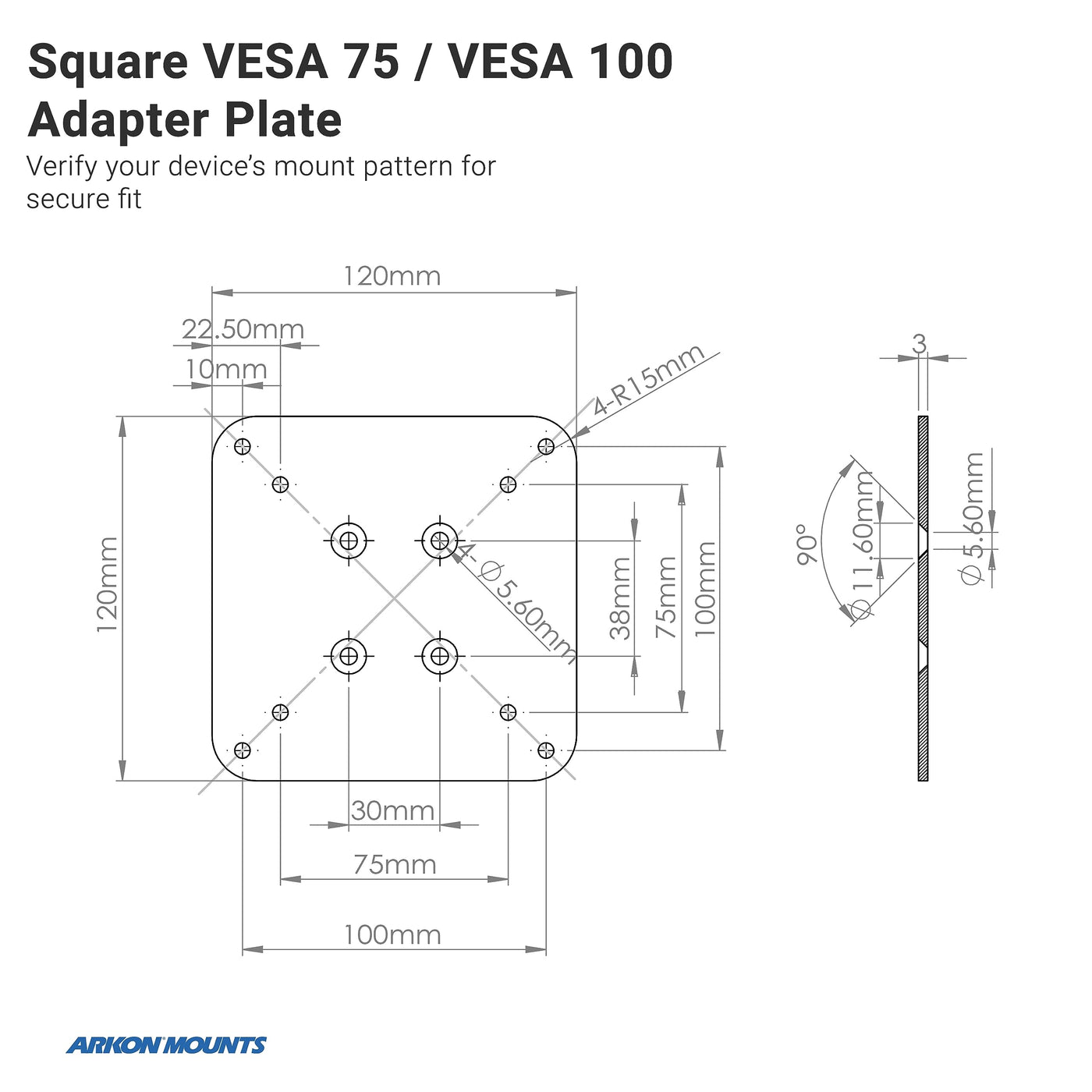 Q: What are the dimensions of the ARKON VESA Adapter Plate?A: The adapter plate measures 4.75 inches (108mm) square, making it suitable for standard VESA 75 (75mm x 75mm) and VESA 100 (100mm x 100mm) applications.