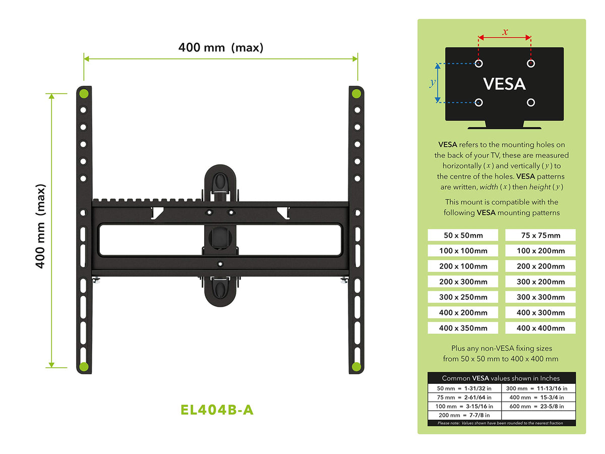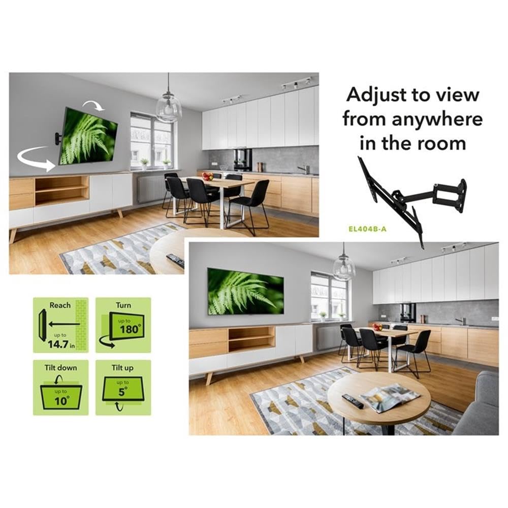 Avf El404B-A Is A Multi-Position, Full Motion (Pan, Swivel, Tilt, Extend) Tv Mount For 32-55 Flat Panel Tvs. It Supports Tvs Up To 66 Lbs And Has A Low Profile Of Only 2.9 From The Wall When Retracted And 14.76 From The Wall When Extended. It Is Vesa Compatible With Hole Patterns 50X50 - 400X400Mm. The El404B-A Tv Bracket Not Only Saves Valuable Shelf Space, But It Also Safely Secures A Tv To The Wall Preventing It From Accidentally Tipping Over And Causing Injury Or Damage. The 3-Piece Design And Yellow Easy-Click Tabs Allows For Quick, Easy, And Secure Installation. It Tilts, Swivels, Pans, And Extends, Which Allows Adjustment For Optimal Viewing Angles, Managing Glare From Light Sources, Or Viewing From Multiple Rooms. This Feature Also Makes It An Ideal Mount To Position A Tv Into A Corner Of A Room. Fits Tvs Up To 66 Lbs, With Screen Sizes: 32 Inch, 37 Inch, 39 Inch, 40 Inch, 42 Inch, 43 Inch, 46 Inch, 47 Inch, 50 Inch, 54 Inch, 55 Inch.