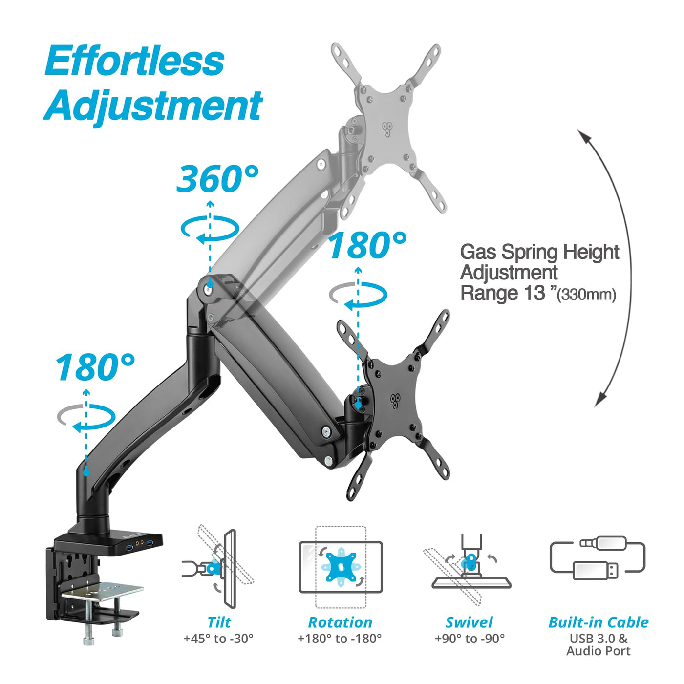 Q: How does the adjustable pneumatic height feature work?A: The adjustable pneumatic height feature allows for smooth height adjustments from 12.8 inches to 25.8 inches (325mm to 655mm). This makes it easy to adapt your monitor's position to your preferred ergonomic viewing height, promoting better posture and reducing neck strain.