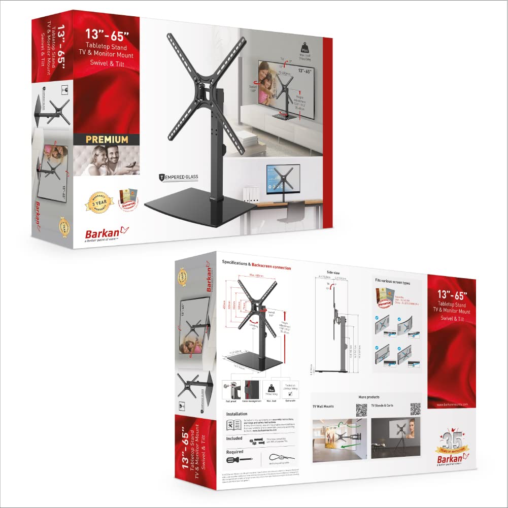 ? 3 Year Warranty - This Mount Was Tested With 3 Times Its Declared Weight. 100% Of Barkan Products Pass Strict Quality Tests. | ? Replace Tv Legs - Elegant Tabletop Stand With A Black Tempered Glass Base, 4 Times Stronger Than Regular Glass. A Perfect Solution When Looking For An Ungrade From The Design And Functionality Of Standard Tv Legs, Or When They Are Lost. | ? Patented, Fits Various Screen Types - This Mount Fits Both Flat And Curved Tvs, As Well As Tvs That Have Special Structures On Their Backs. Some Of The Tvs Have Unique Structures On Their Backs Such As Bumps, Indentions, Or Nonstandard Connection-Hole Patterns. Those Special Structures Make It Impossible To Use Normal Tv Mounts. To Solve This Problem Without Customers Making Unnecessary Purchases, We Developed A Line Of Products Based On A Ball And Socket Mechanism, Just Like In A Human Shoulder. The Four Adapters Can Move In 2 Dimensions Which Allows The Mount To Hug The Screen Firmly Without Any Use Of Spacers Or Other Improvised Solutions. | ? Features - The Tv Mount Fits Most 13-65' Tvs Up To 80 Lbs. Fits Tvs With Vesa (Bracket Mounting Holes Patterns) 75X75, 100X100, 100X200, 200X100, 200X200, 200X300, 300X300, 300X400, 400X200, 400X300, 400X400 Mm And Non Vesa Up To 400X400 Mm. | ? Functionality - To Provide A Better Point Of View, The Stand Has 3 Height Adjustment Options, Swivels Near The Screen Connection Plate +-70� And Has A Tool-Free Tilt From 0� Till 15�. | ? Touch & Move - Easily Rotate, Swivel Or Tilt The Tv By Gently Pushing Or Pulling It To The Desired Angle. Enjoy The Perfect Point Of View Without Any Trouble. | ? World Known Brand - Since Its Foundation In 1988, Barkan Mounts Has Been Working To Enhance The Viewing Experience Of The Customer. Our Expertise Is In The Development, Manufacturing And Marketing Of Designed And Innovative Tv Mounts. Our Customer Service Experts Are Available Every Day Of The Week, And Are Ready To Help! Visit Our Website To Find More Information, Any Kind Of Help, Manuals, Faq And More. | ? Touch & Move - Easily Rotate, Swivel Or Tilt The Tv By Gently Pushing Or Pulling It To The Desired Angle. Enjoy The Perfect Point Of View Without Any Trouble. | '? Kids Safety - Child Safety Is Of The Utmost Importance. When It Comes To Tvs And Appliances Our Goal Is To Raise The Awareness Of Possible Dangers From A Tip-Over Of The Tv. The Safest Solution Is To Hang The Tv On A Strong And Safe Mount. Therefore, All Barkan Tv Mounts Include A Fall Proof System That Prevents Disengagement Of The Screen.'