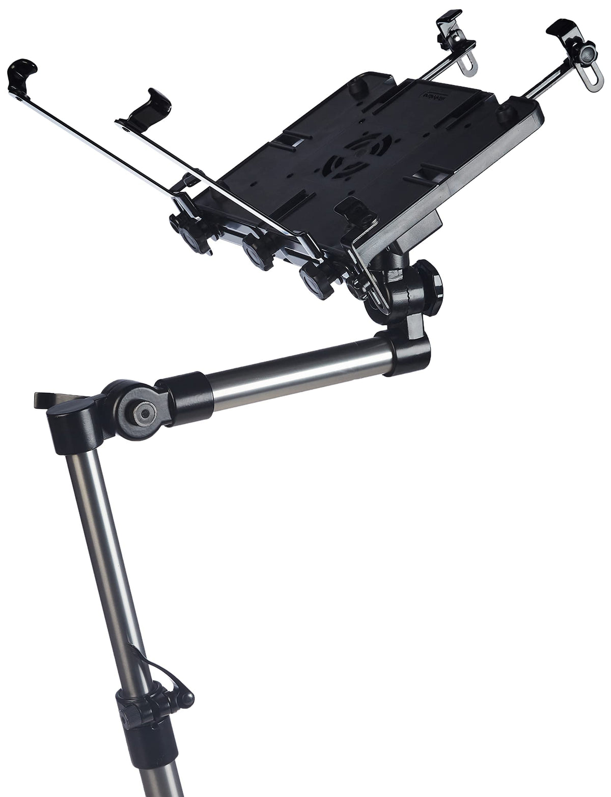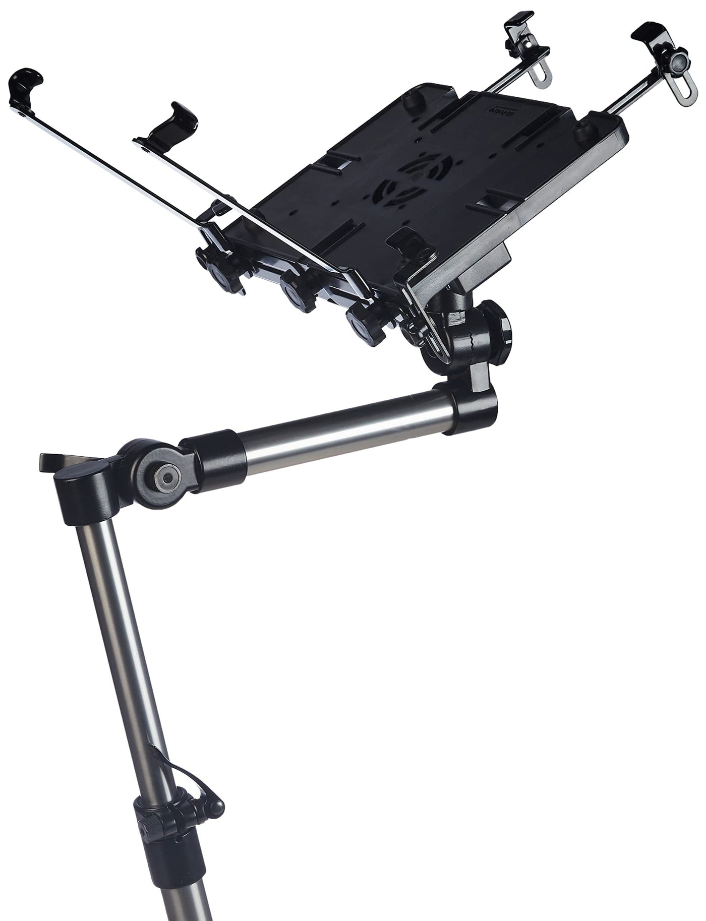 Q: What materials is the laptop mount made from?A: The mount is constructed from heavy-duty 30-millimeter aluminum tubing and high-strength alloy locking joints, ensuring durability and stability while in use.