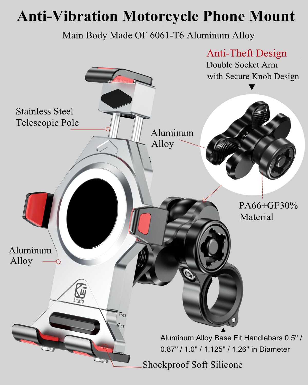 Aluminum Alloy Anti-Theft Motorcycle Phone Mount With Vibration Dampener, Compatible With 4.7'' - 7.2'' Cellphones (Silver)