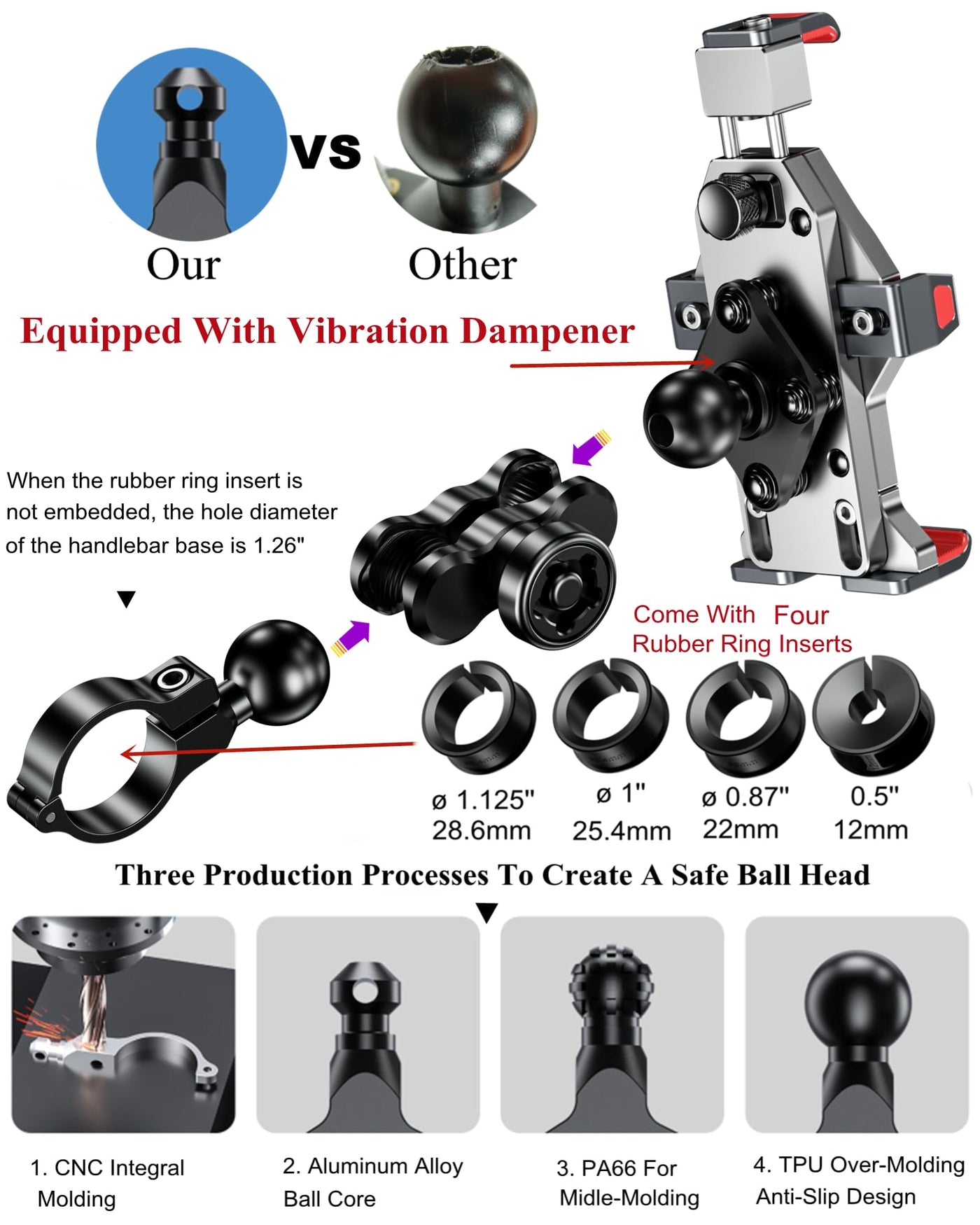 Brcovan Motorcycle Phone Mount With Vibration Dampener, Solid Aluminum Alloy, Anti Theft Motorcycle Phone Holder, Adjustable Handlebar Cell Phone Holder For Bike Scooter Atv, Fit 4.7'' 7.2'' Phone