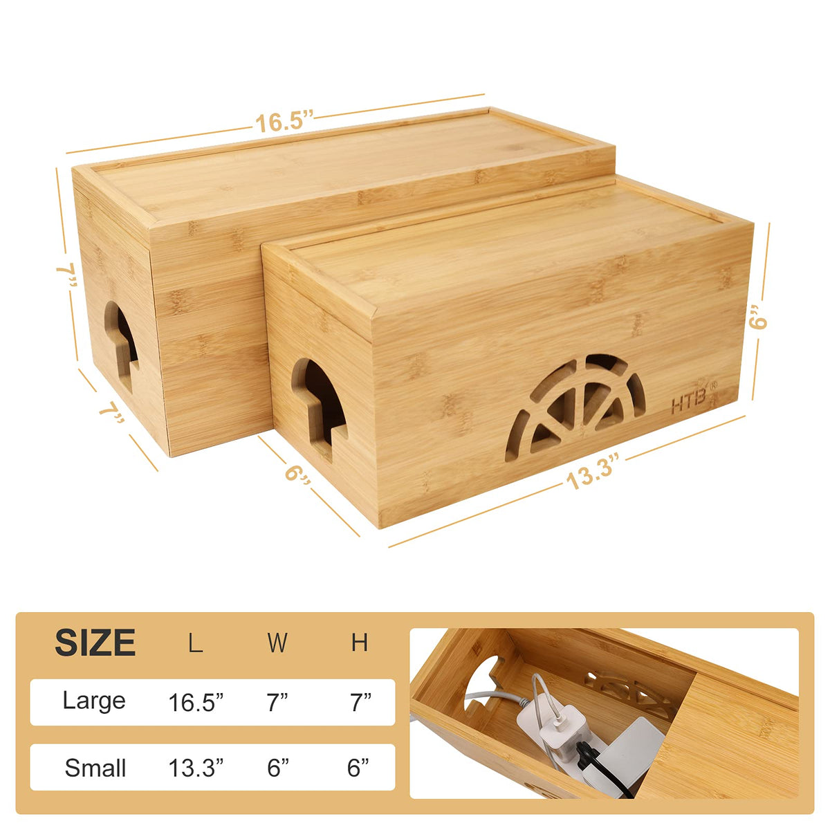Q: What are the dimensions of the bamboo cable management boxes?A: The set includes two cable management boxes: the Large box measures 16.5 x 7 x 7 inches, and the Small box measures 13.5 x 6 x 6 inches.