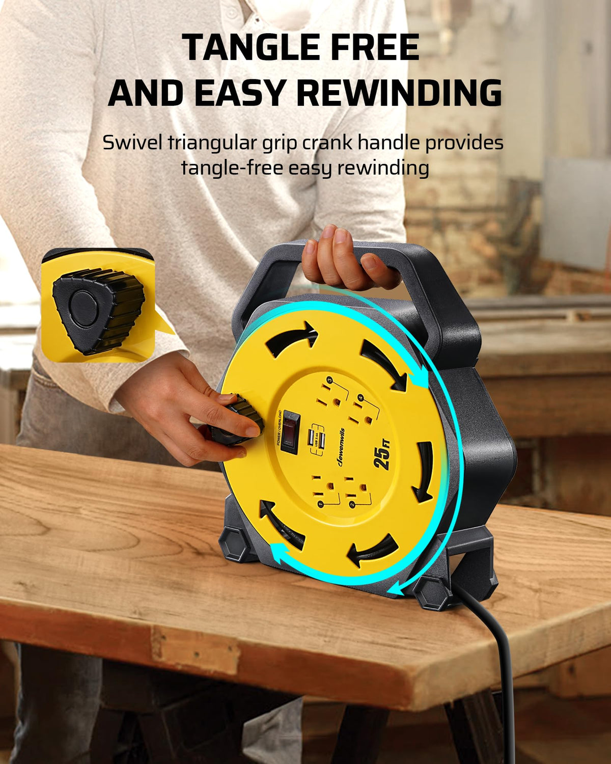 Dewenwils Hand Wind Extension Cord Reel Fextures With 2-Usb Charging Ports; 4-Ac Outlets; 25Ft Retractable Extension Cord