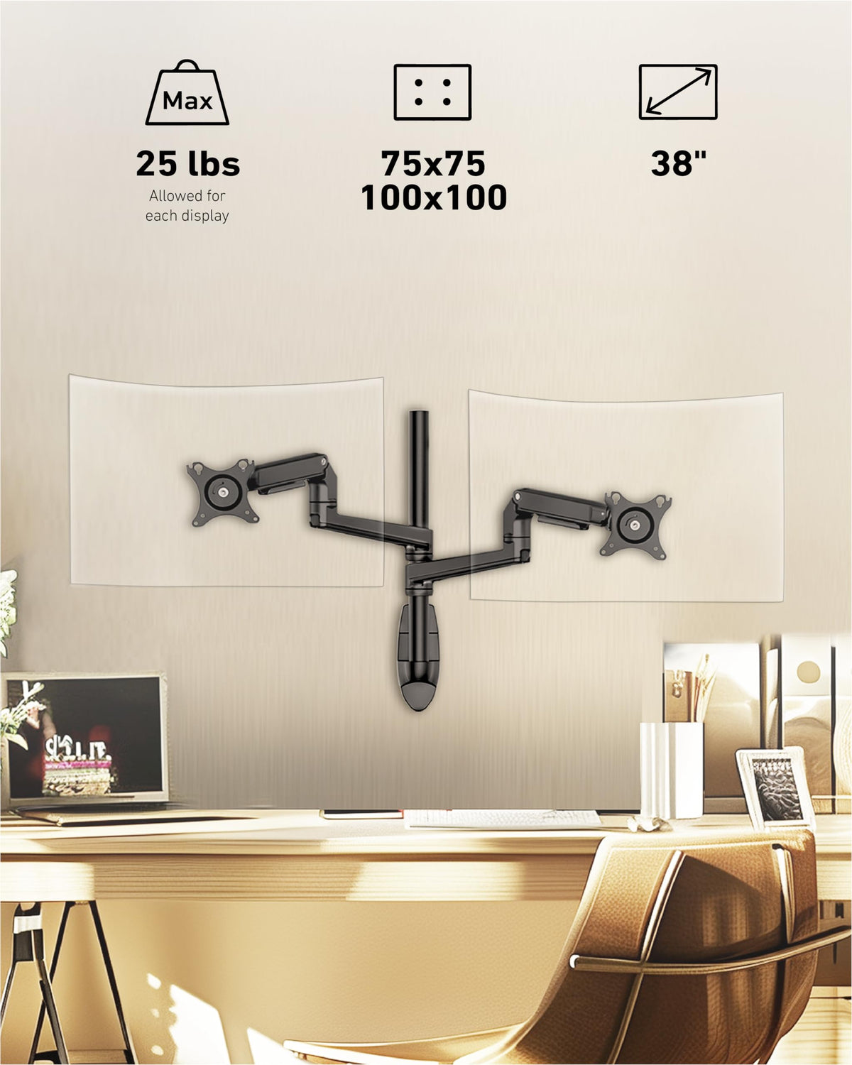 Thank You For Reviewing W66 Height-Adjustable Dual Monitor Stand For Wall. This Vesa Monitor Wall Mount With Perfect Design Fits Most Screens Up To 38 Inches Within 25 Pounds, Compatible With Vesa Mount Patterns Of 75X75Mm Or 100X100Mm. Please Check The Size, Weight, Vesa, And Wall Types Before Purchase. With A Solid Aluminum Body, This Monitor Arm Wall Mount Will Protect Our Devices From Shock. It Can Be Very Secure When Mounting On The Right Walls, Such As Most Wood, Concrete, And Brick Walls. (Note: Don'T Install Into Drywall Alone )The Mechanical Spring Arm Not Only Features A Flexible Movement Structure, But It Is Also A Heavy-Duty Build: Safer, More Stable, And More Durable Than The Gas Spring. (We Can Also Adjust The Tension According To The Weight Of Our Monitor.)This Wall Mounted Monitor Arm Enables Instant And Effortless Adjustments:+90 To -25 Tilts, 180 Swivel, And 360 Rotation, Which Help Us To Achieve The Optimal Position For Work, Even Perfect For A Standing Workstation. It Is A Good Idea To Mount A Monitor On The Wall If We Want To Free Up Desk Space. Besides, The Monitor Wall Arm Can Also Be Retracted To The Corner, Coupled With Hidden Cable Management, A Tidy Workstation Is Always Refreshing. Finally, Thanks For Taking Time With Us And Please Feel Free To Contact Us No Matter Before/During/After Sales When You Have Any Questions. Your Satisfaction Is Always Our Top Priority.