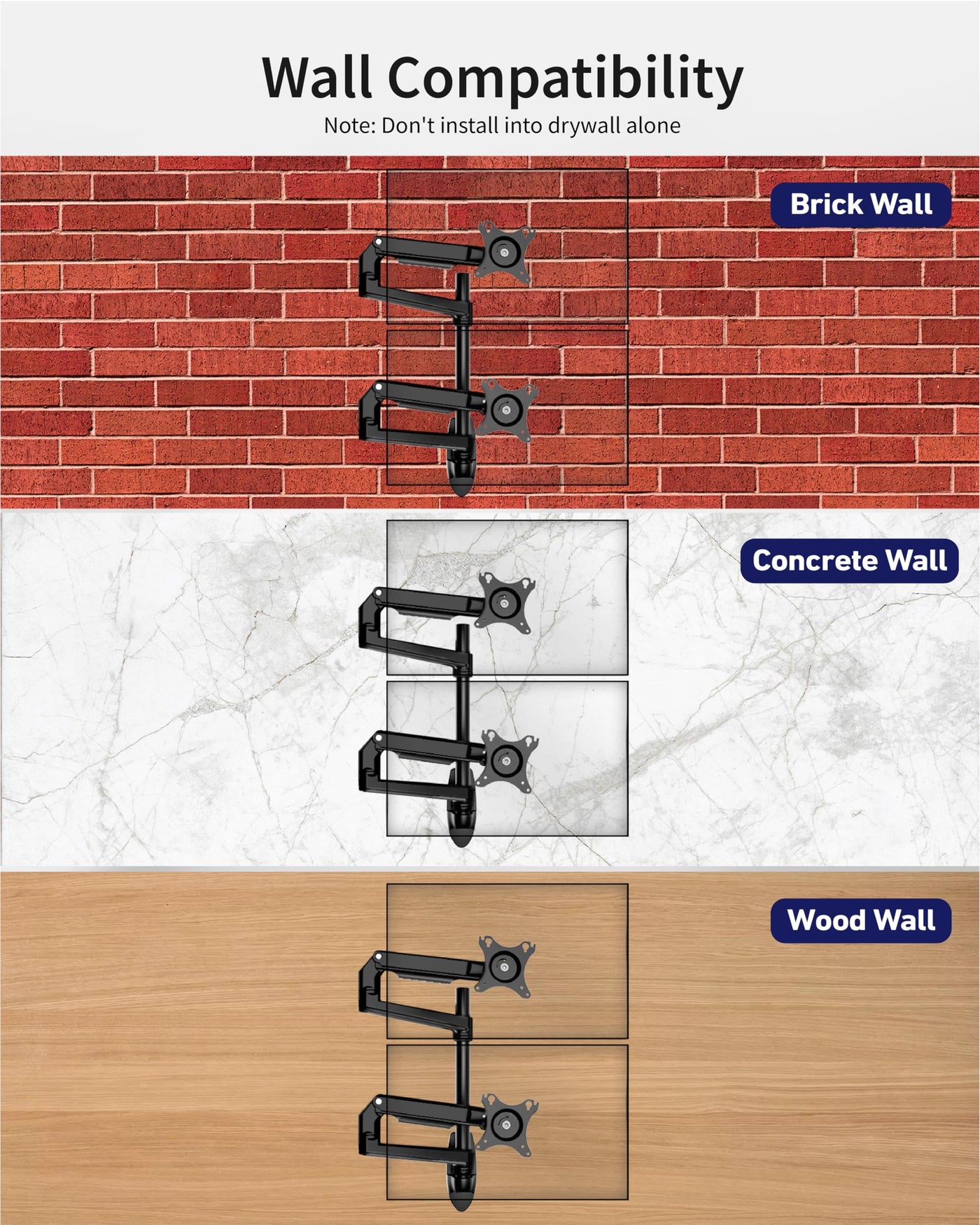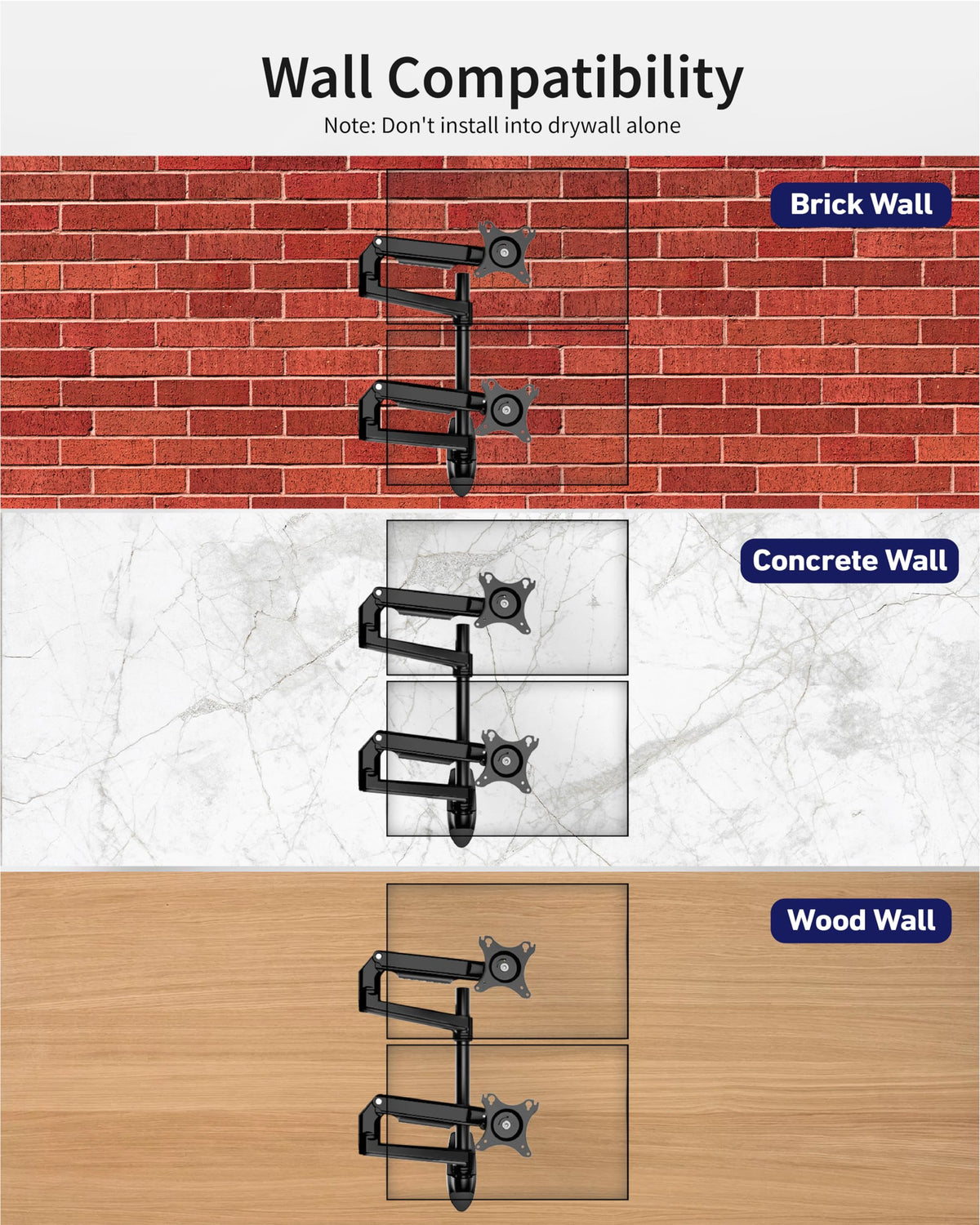 Q: Can this monitor mount be installed on all types of walls?A: The mount is secure when installed on solid surfaces such as wood, concrete, or brick walls. It is not recommended to install it into drywall alone, as it may not provide adequate support.