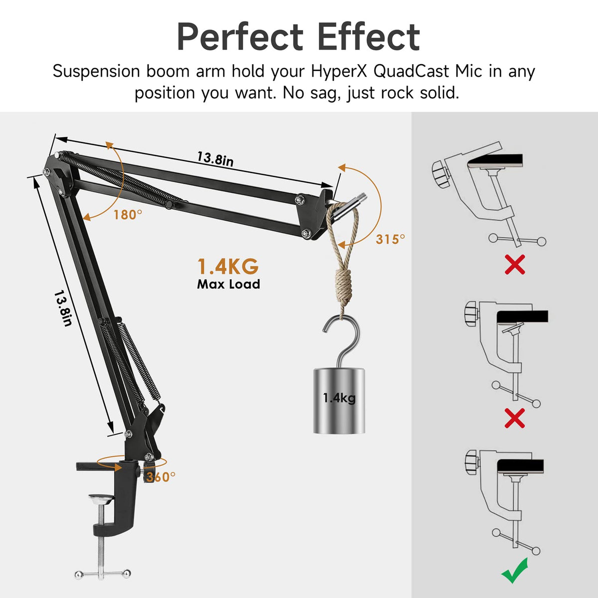 Is The Desktop Microphone No Longer Able To Meet Your Needs? Continuously Adjusting The Height Of The Chair To Keep The Mic Next To The Mouth? The Microphone Often Pops Or Is Disturbed By Nearby Noises? Then This Hyperx Quadcast Boom Arm With Pop Flter Can Help You. Rugged Synthetic Metal, Dual Support Arms And Springs For A Variety Of Situations. The Hyperx Quadcast Mic Stand Boom Can Be Rotated 360 Horizontally, The Upper Boom Can Be Adjusted Up And Down 180, And The Extension Rod Can Be Rotated 270. The Hyperx Quadcast S Mic Stand Is Easy To Adjust And Has 2 Rotary Knobs, Which Can Be Tightened At Any Time To Maintain The Ideal Position. Microphone Pop Filter Specially Adapted For Hyperx Quadcast, Perfect Fit, Filter Surrounding Noise, Make Your Voice More Clearly Conveyed. Note: Product Does Not Include A Microphone Specification Stand Length: 13 Inches X 13.8 Inches Max Clamping Thickness Of The Base: 1.8 Inches Max Load: 3.1Lb (1.4Kg)
