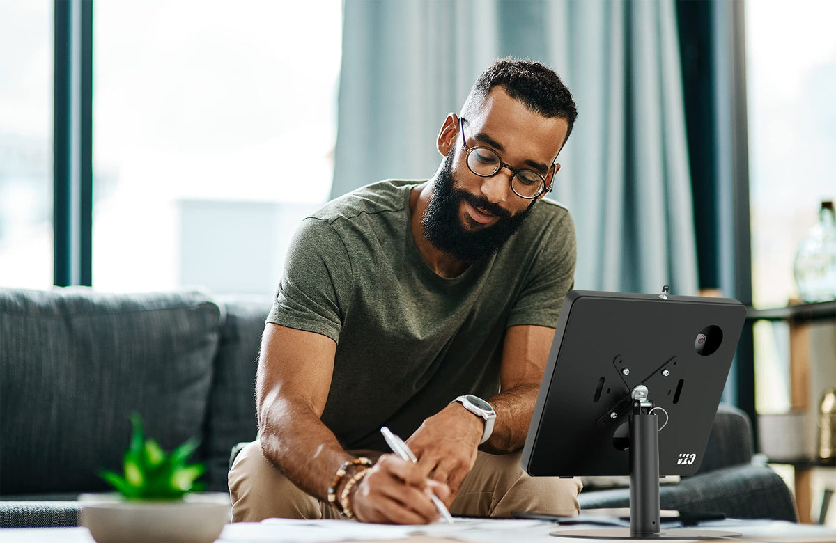 The Two Words Best Used To Describe This Product Are Secure And Convenient. The Large Enclosures Heavy-Duty Steel Exterior Protects Devices From Wear-And-Tear, While The Sturdy Lock Prevents Theft. Soft Foam Grips Throughout The Interior Keep Your Device Cozy And Scratch-Free. A Hollow Center Allows Neat Cable Routing Directly Through The Stand Itself, Creating A Clean, Professional Look. Two 360-Degree Swivels - One At The Base And One At The Mount - Which Makes This Perfect For Personable Point-Of-Sale Transactions. Use The Included Galvanized Steel Locking Cable To Doubly Secure Your Device. Simply Lock One End Directly To The Stand And Tether The Other To Any Permanent Fixture. Compatible With Larger Devices Including The Ipad Pro 12.9 2015, 2017, 2018,2020, 2022 And Surface Pro 3/4/5/6/7/8/X
