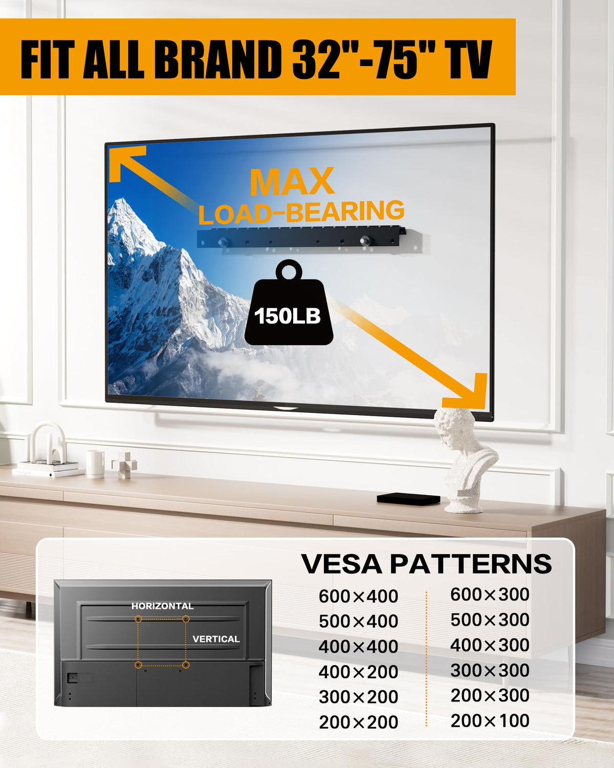 ?No Stud Tv Wall Mount For Up To 75 Inch? Hypigo Screwless Tv Mount Fits Vesa Patterns From 200X100Mm To 600X400Mm. Compatible With Samsung, Tcl, Sony, Vizio, Lg, Panasonic, Toshiba, Sharp, Philips, Element, Sceptre, Hisense, Etc. (The Vesa Mounting Patterns Are The Distances In Mm Between The Four Screw Holes On The Back Of The Tv) ?Studless Tv Wall Mount? This Apartment Friendly Tv Wall Mount Requires No Screws, No Drilling, No Adhesive. The Hypigo Studless Flat Screen Tv Wall Mount Will Not Damage Drywall ?No Experience Required, Easy Installation? This Renter Friendly Tv Mount Comes With Comprehensive English-Language Step-By-Step Instructions And Detailed Diagrams. It Includes All Necessary Mounting Hardware And A Bubble Level, Specifically Designed For Single-Person Installation, Ensuring You Can Easily Set Up This No Drilling Tv Wall Mount Within 10 Minutes ?Aluminum Alloy For Reliable Strength? This Easy Tv Wall Mount No Drill Required, Is Crafted Out Of Top-Grade Aluminum Alloy, Offering 100 Lbs Of Strength. It Wont Rust Or Break And Will Last Longer! ?Friendly After-Sales Support? If You'Re Not Completely Satisfied With This Drywall Tv Mount, Simply Let Us Know. We Offer A 5-Year Customer Service Guarantee, So Please Feel Free To Contact Us Anytime, Rain Or Shine. :-)&Nbsp;