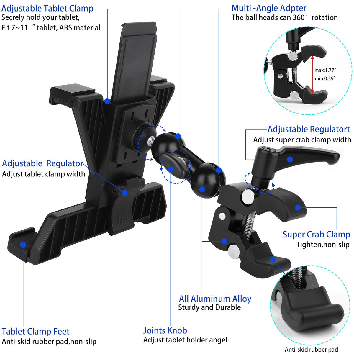 Introducing The Itodos Tablet Holder, A Versatile And Durable Solution For Mounting Your Tablet To Various Rods Such As Those Found On Spin Bikes, Strollers, Treadmills, Golf Carts, Wheelchairs, Stationary Bikes, Microphone Stands, And More. Constructed From High-Quality Aluminum Alloy, This Tablet Holder Boasts A Super Crab Clamp And Articulating Magic Arm, Both Equipped With Built-In Anti-Skid Rubber Pads For Increased Friction And Reduced Scratches. The Magic Arm Features Two Ball Joints With 360 Rotation, Allowing For Optimal Viewing Angles. The Tablet Clip Is Adjustable And Compatible With 7-11 Inch Tablets, Including Various Models From Apple, Samsung, Google, Huawei, And More. The Super Crab Clamp Has A Max Adjustable Diameter Of 1.77 Inches, Ensuring A Firm Hold On Various Handlebars. The Package Includes The Aluminum Alloy Magic Arm With Super Crab Clamp And A Tablet Clip. Please Note That It May Not Fit Very Thick Cases, Accommodating Up To 0.7 Inch Thickness For A Tablet With A Case. Experience Convenience And Flexibility With The Itodos Tablet Holder.