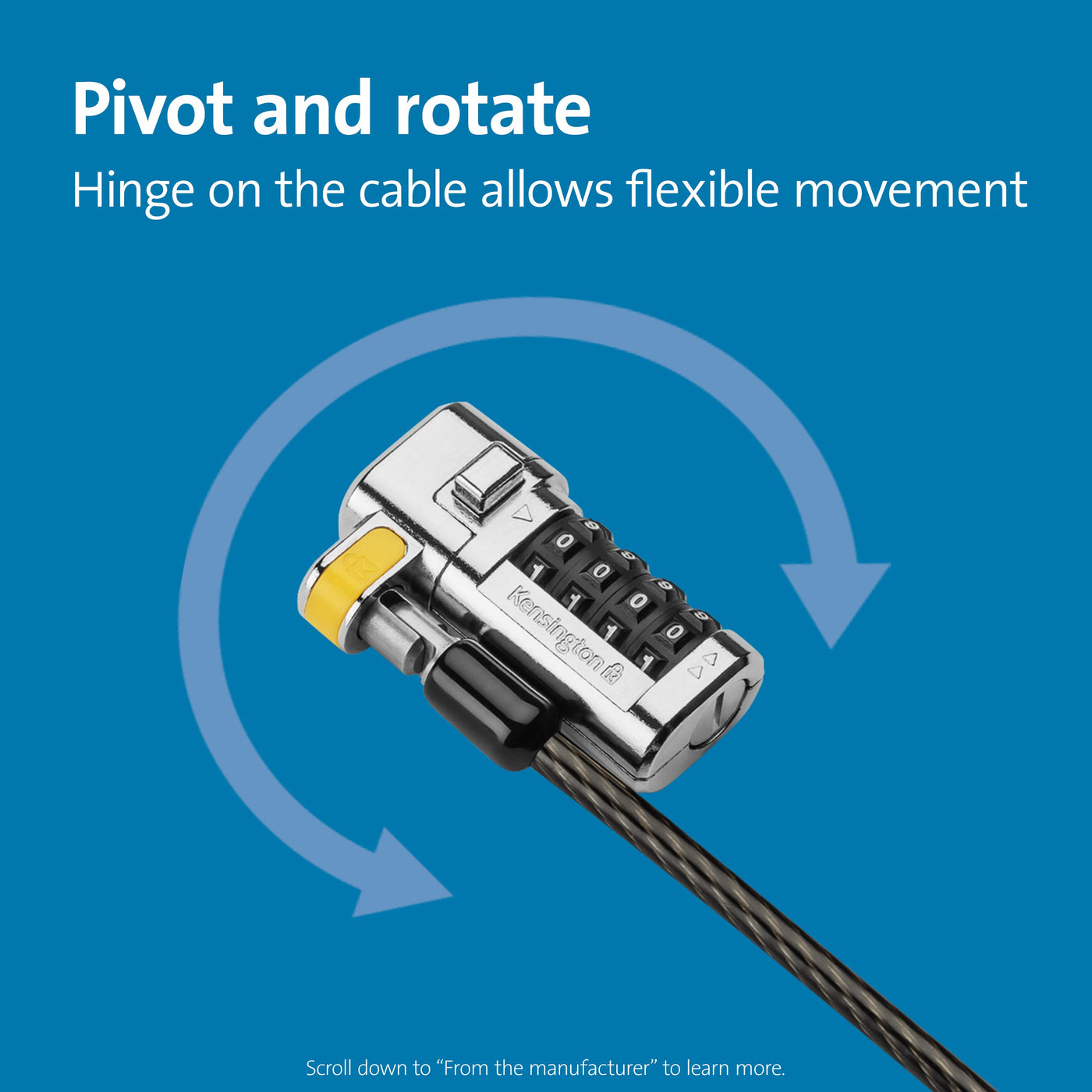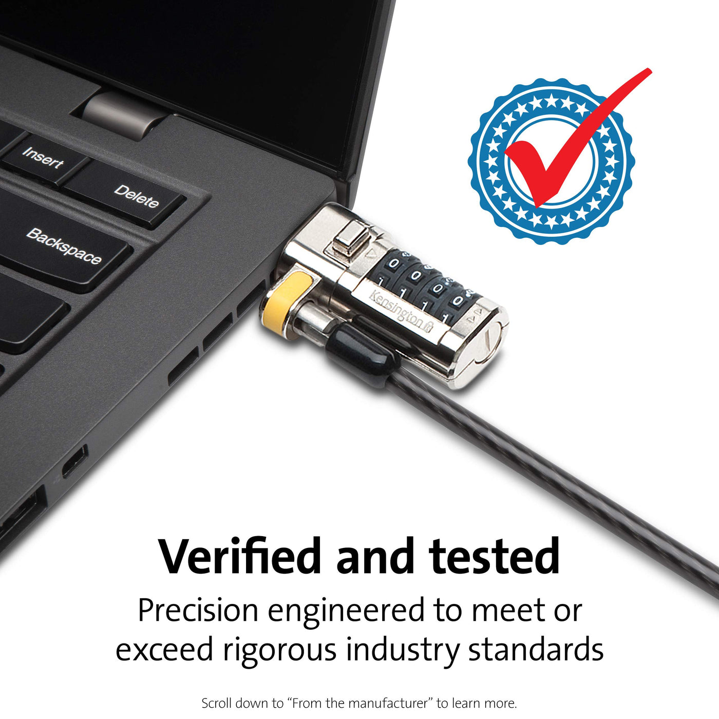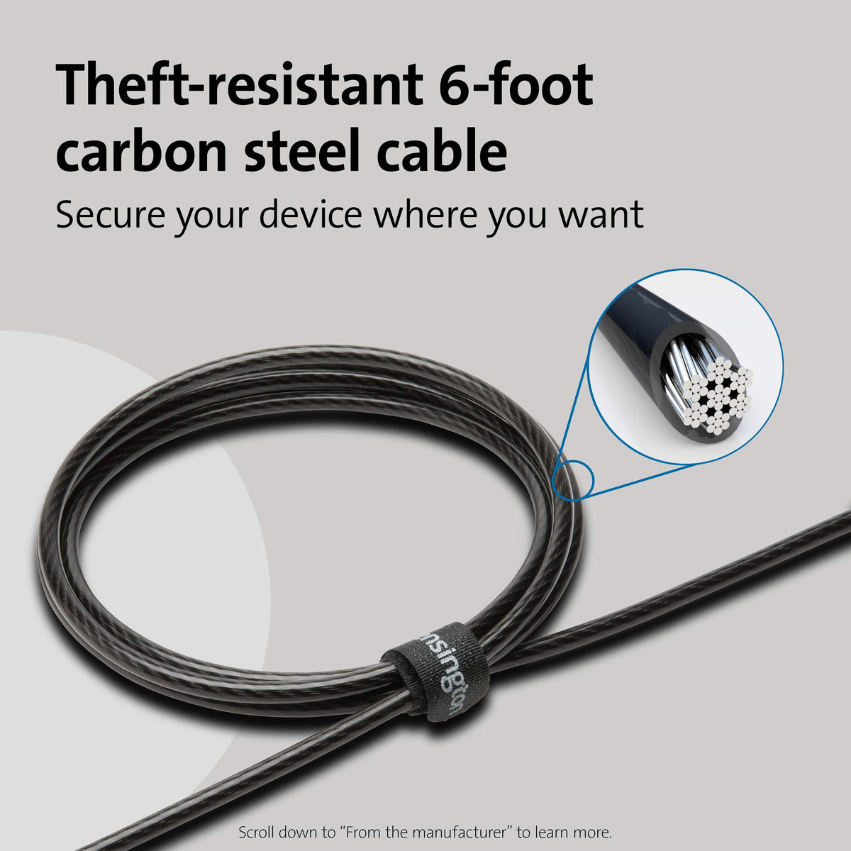 Q: What is the length and material of the cable used in the Kensington lock?A: The Kensington ClickSafe lock features a 6-foot long carbon steel cable that is cut-resistant. This robust material ensures your laptop remains secure while allowing flexibility in how and where you anchor it.