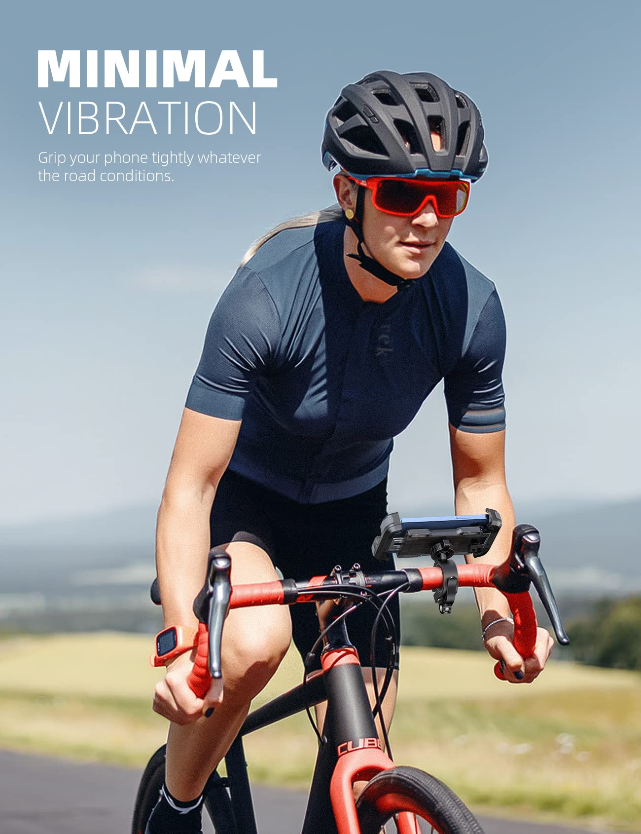 Q: How does the 360° rotation feature work on this phone mount?A: The Lamicall phone mount features a 360° rotating ball joint that allows you to easily adjust the viewing angle of your phone, whether you prefer it horizontal or vertical. This makes it convenient for using GPS, answering calls, or playing music while riding.