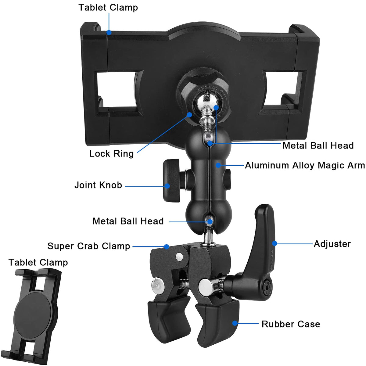 Q: What materials are used in the construction of the tablet holder?A: The Mippko Tablet Holder is constructed with durable materials, including an aluminum alloy for the mount arm and clamp, and high-quality ABS for the tablet clamp. The super crab clamp also includes a rubber pad to prevent scratches and ensure a tight grip.