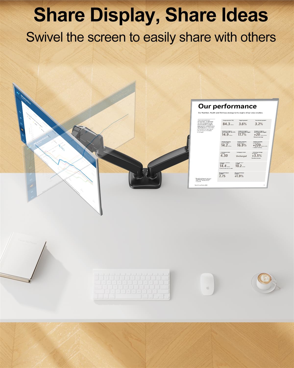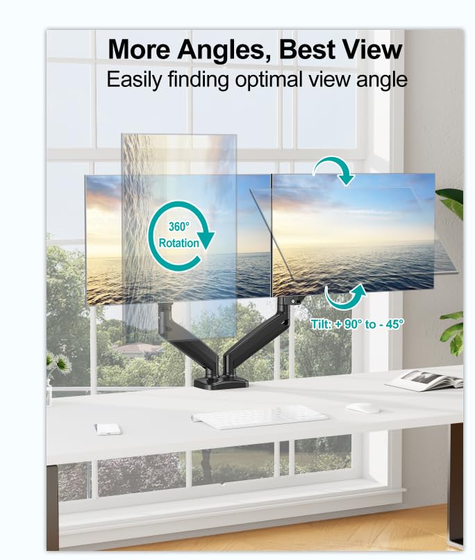 Product Specifications:1. Material: Precision Plastic & Steel And Aluminum2. Monitor Adjustable Height: 0 - 16.9 Inches From The Table Surface3. Tilt: +90 ~ -45 Degree4. Swivel Angle: +90 ~ -90 Degree5. Rotation: +180 ~ -180 Degree6. Max Extension 19.8Inchnote: This Double Monitor Mount Only Fit Monitors Which Own The Following Three Specs At The Same Time:1. Screen Size: Up To 32''2. Weight Capacity: 4.4Lbs To 17.6Lbs3. Must Have Vesa Mounting Holes And The Vesa Pattern Is 75X75 Or 100X100Mm.Main Features1. Stable And Fully Adjustable Desk Monitor Mountmany People Stare At The Computer Screen Most Of The Day. This Dual Monitor Stands For Desk Allows Free Switching Of Horizontal And Vertical Screens, 180 Swivel, Tilt +90 To -45, Easily Help You Get The Optimal Viewing Position, Perfectly Meet All The Office And Home Applications. Maximize Our Comfort And Pleasant Viewing Experience. 2. Healthy Working Stylea Good Sitting Posture Is Essential For A Healthy Life. The Daily Tool Should Fit Each Of Us Individually, Instead Of People Adapting To The Machine. Using This Vesa Monitor Mount Can Improve Posture, Relieving Strain On The Neck & Shoulders While Increasing Productivity Levels.3. Extra Flexibilitythis Dual Arm Monitor Mount Allows You To Adjust The Height Smoothly And Freely. You Can Make Your Monitors Stays At Any Height You Adjust. Just Adjust Your Monitor Position With The Touch Of A Finger!4. Get More Valuable Desk Spaceyou Can Quickly Win Back Your Workspace By Floating Your Monitors In The Air, Thanks To The 5.51'' X 3.94'' Premium Mounting Base Replacing The Monitor'S Original Base.5. More Possibilitieswith A Modern Design, Complement All Desktops, Which Makes It Fantastic For Homes, Dorms, Schools, Businesses, Offices, It Networks, Manufacturing Plants, And More. Ideal For Designers, Programmers, Etc.