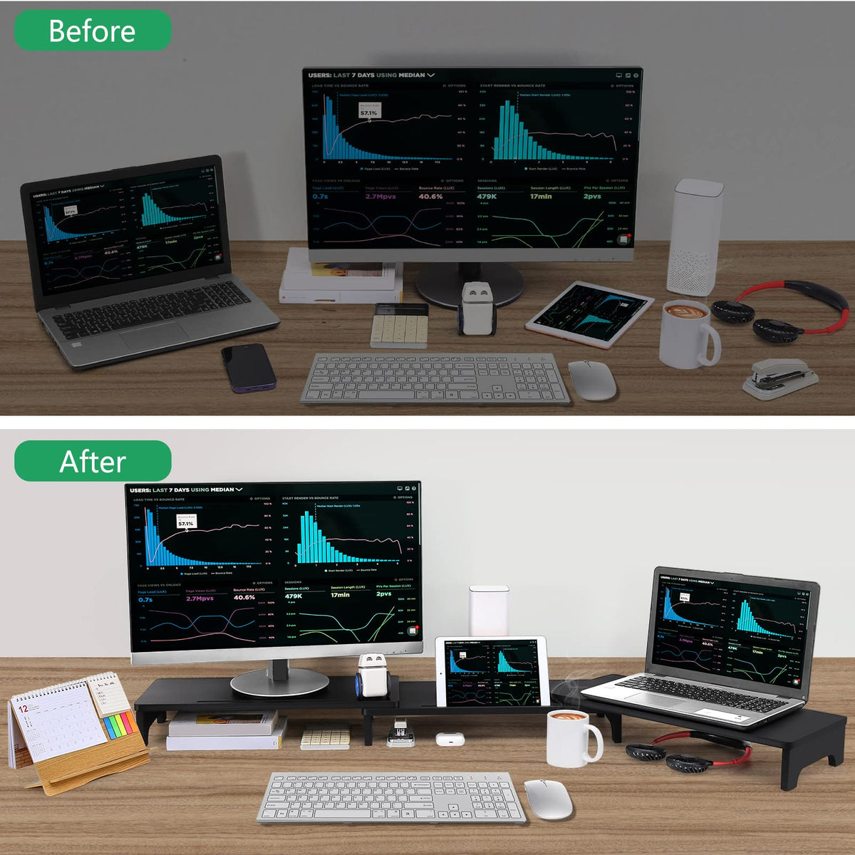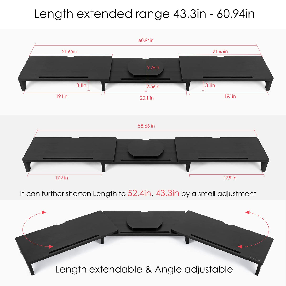 Beyond Your Imagination It'S An Extra Wide Triple Monitor Stand. ?? For A Large Office Desk - A Generous And Decent Gift For Your Superior. Good For Relaxedly Complete The Task. ?? For Meeting Room - Effectively Organize The Working Station And Support Several Devices. ?? For Home Study Room - Possibly Get Rid Of The Pain From Incorrect Long-Time Posture High&Environmental Friendly Quality Material With Short Growing Cycle, Bamboo Can Grow Up Quickly. Bamboo Was Regard As ''Iron Bamboo Plants'', Which Make It Match The Tensile Strength Of Steel. The Bamboo Material Itself Has Characteristic Of Heat-Dissipation. Bamboo Fragrance We Adopt The Superb Technical Craft And Made This Pad With Our Whole Care So As To Produce The Superb Product. We Try Our Utmost To Maintain The Fragrance Of Bamboo So As To Please All Of You. Specification Heigh: 3.9In Width: 9.8In Adjustable Length: 58.4In Or 60.7In Tablet Slot:12X0.6X0.35In(L/W/D)