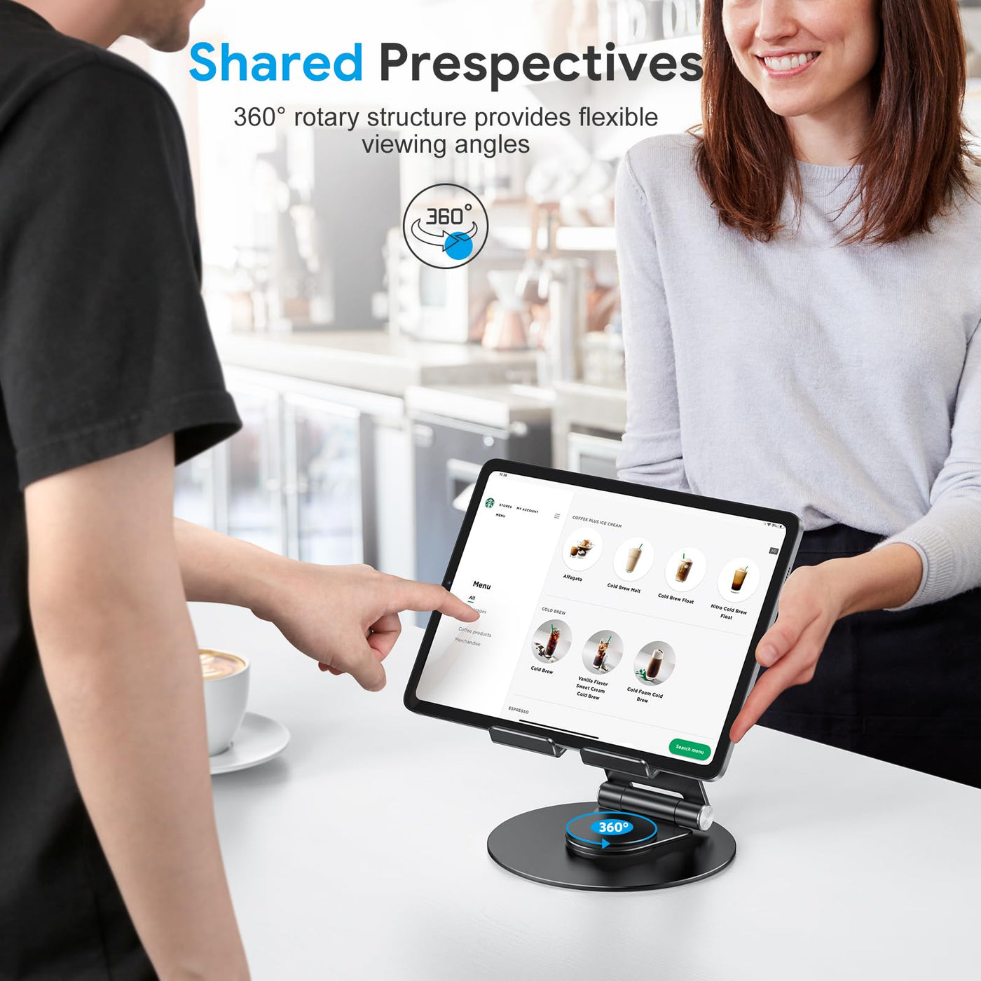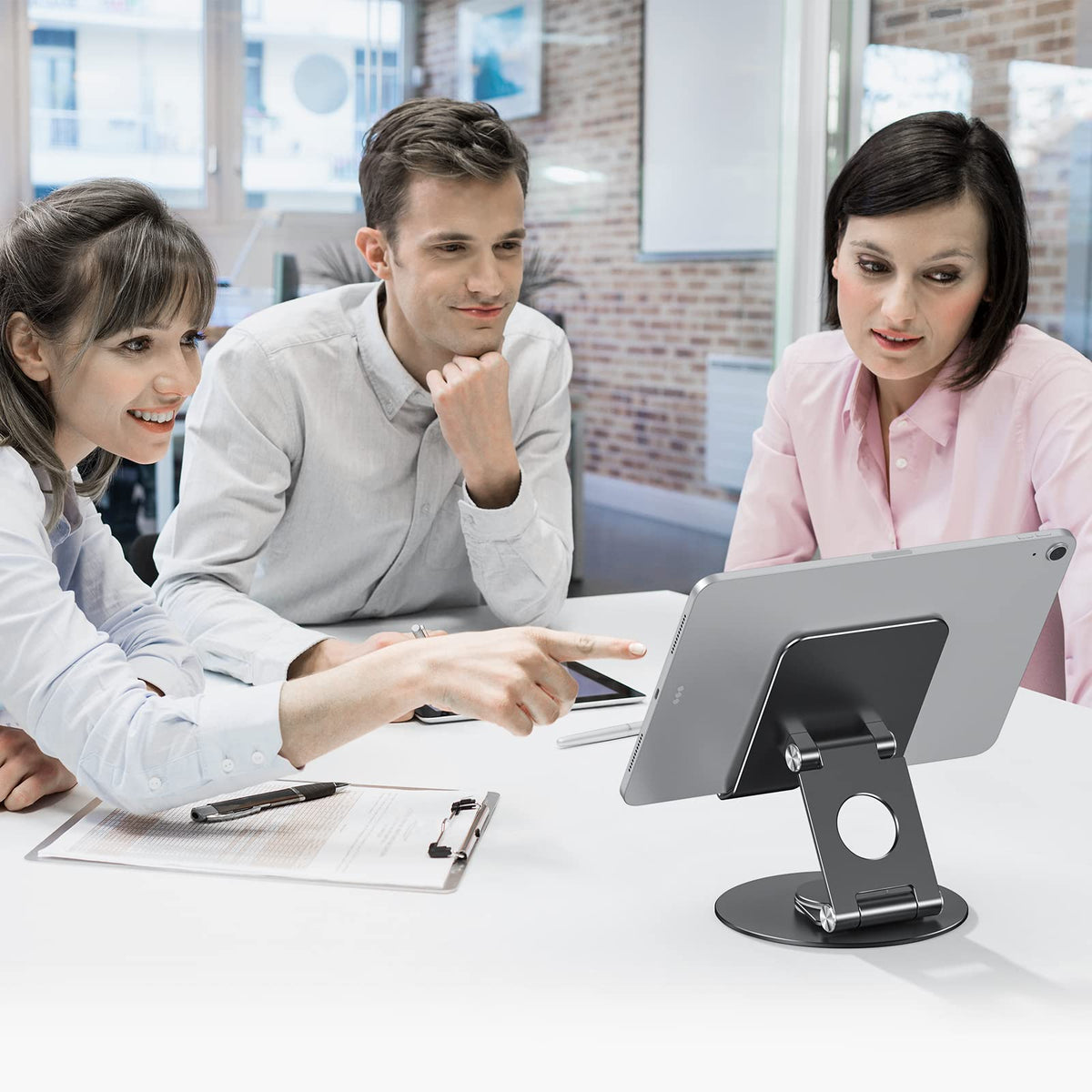 Q: Can this tablet stand rotate 360 degrees?A: Yes, the OMOTON Swivel Tablet Stand features a 360° rotating base, allowing you to easily share your screen or create content from any angle.