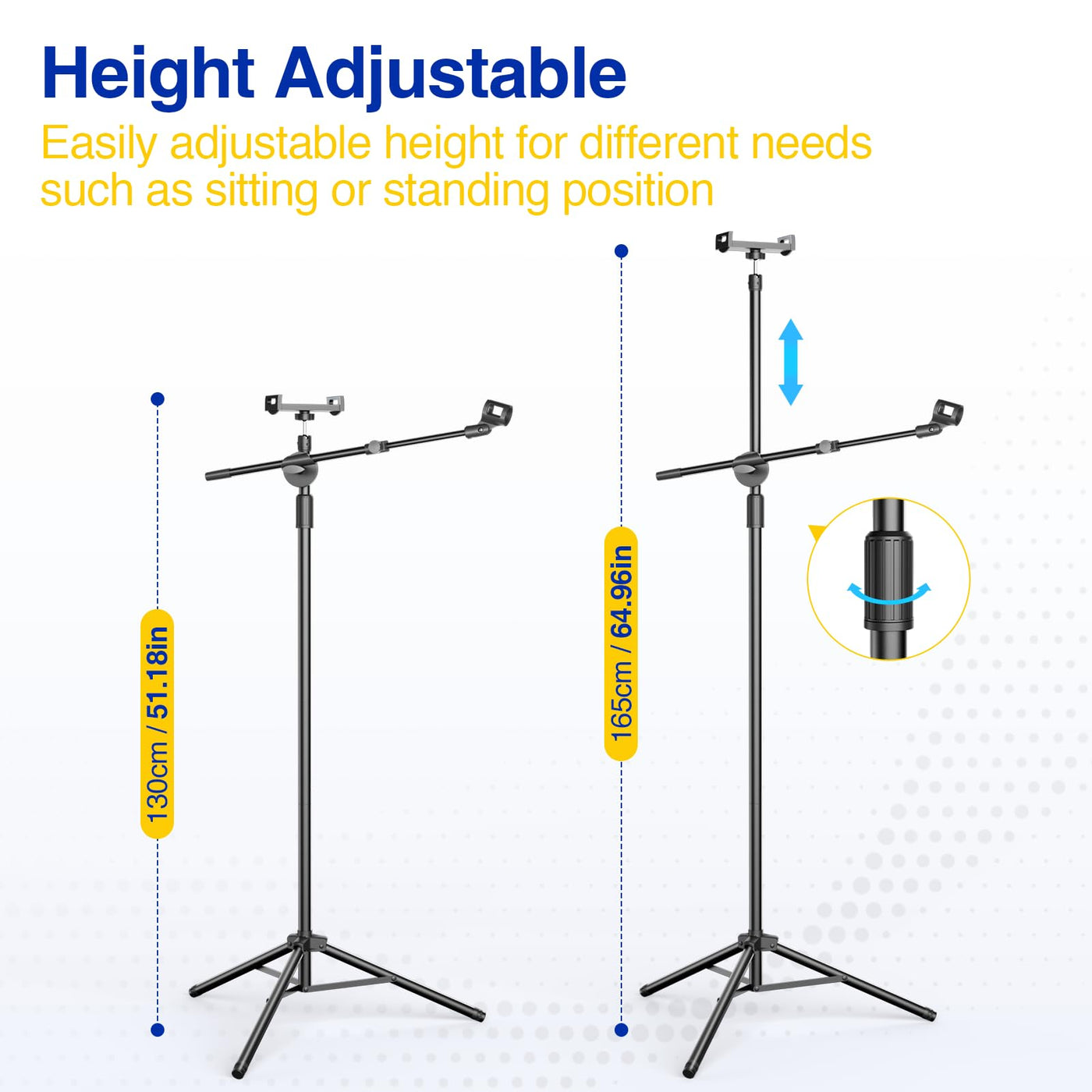 Oukmic Boom Mic Stand, Microphone Holder Floor With Tablet Phone Support, Heavy Duty Tripod Adjustable Height And Angle 35-65 In