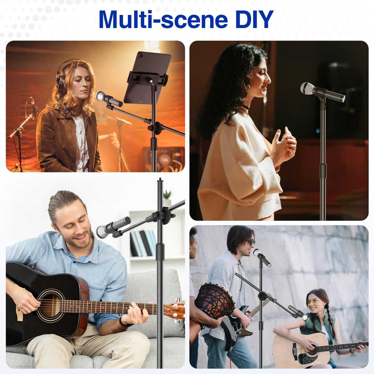 Why Choose The Oukmic Multi-Functional Microphone Stand? More Stable Oukmic Microphone Stands Please Place The Boom Arm Parallel To Either Leg Of The Stand For Maximum Stability. The More Convenient Oukmic Mic Stand The Portable Dual Hanging Mic Stand Package Comes With A High-Class Carrying Bag, Just Adjust The Height To The Lowest, And Then Put It Into The Carrying Bag, No Need To Break It Into Pieces, Truly Portable. In Addition, The Microphone Clip Is Designed With A Knob Adjustment So That You Can Easily Adjust The Angle Of The Microphone Without Using A Screwdriver For The Stage, Studio, Concerts, Outdoor Performances, And Other Types Of Activities To Provide Great Convenience. Free Combination Support Boom, Microphone Clip, Ipad Stand-Free Combination, To Meet All Your Needs Multi-Scenario Application Indoor Live Broadcast/Speech/Hosting/Teaching / Outdoor Performance / Live Broadcast/Performance / Entertainment/Recording / Voiceover