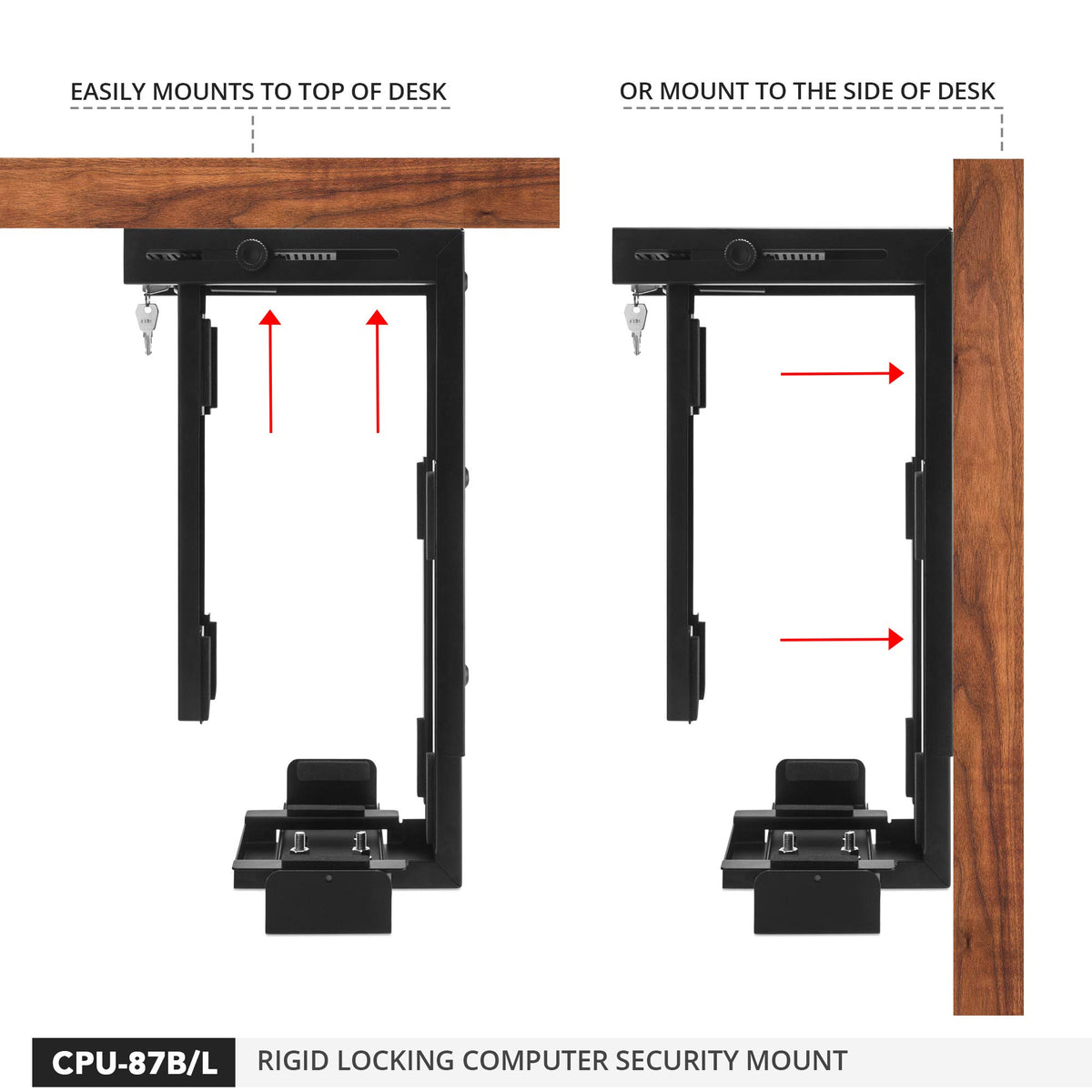 You�Ve Invested Too Much Time And Energy Into Your Personal Desktop Computer For Anything To Happen To It, So You Want To Do Everything You Can To Keep Each Piece Of It Safe And Running Smoothly For Years. With This Adjustable Under-Desk Computer Holder From Penn Elcom, You Will Be Able To Keep Your Cpu Up Off The Floor, Away From Dust And Lint, And Securely Attached To Your Desk. Our Under-Desk Mount For Computers Is Designed With Solid Steel, Heavy-Duty Hardware, To Ensure That It Can Support The Weight Of Your Equipment. Plus, Our Mounted Holder Features A Lockable Bracket So That You Can Have The Peace Of Mind That Your Pc Is Safe. This Under-Desk Pc Mount Comes With All The Hardware Needed To Quickly Install The Holder And Get To Work, And Includes 2 Optional, Adjustable Mounting Brackets That Allow It To Be Attached To Almost Any Desk Type. At Penn Elcom, We Want To Provide Exceptional Office Accessories And Space-Saving Solutions That Will Suit Your Needs. If You Aren�T 100% Satisfied With This Computer Tower Holder For Under Desks, Return It Within 30 Days For A Full Refund Or Replacement. Product Details: (2) Optional Adjustable Mounting Brackets Mounting Hardware Material: Steel Color: Black