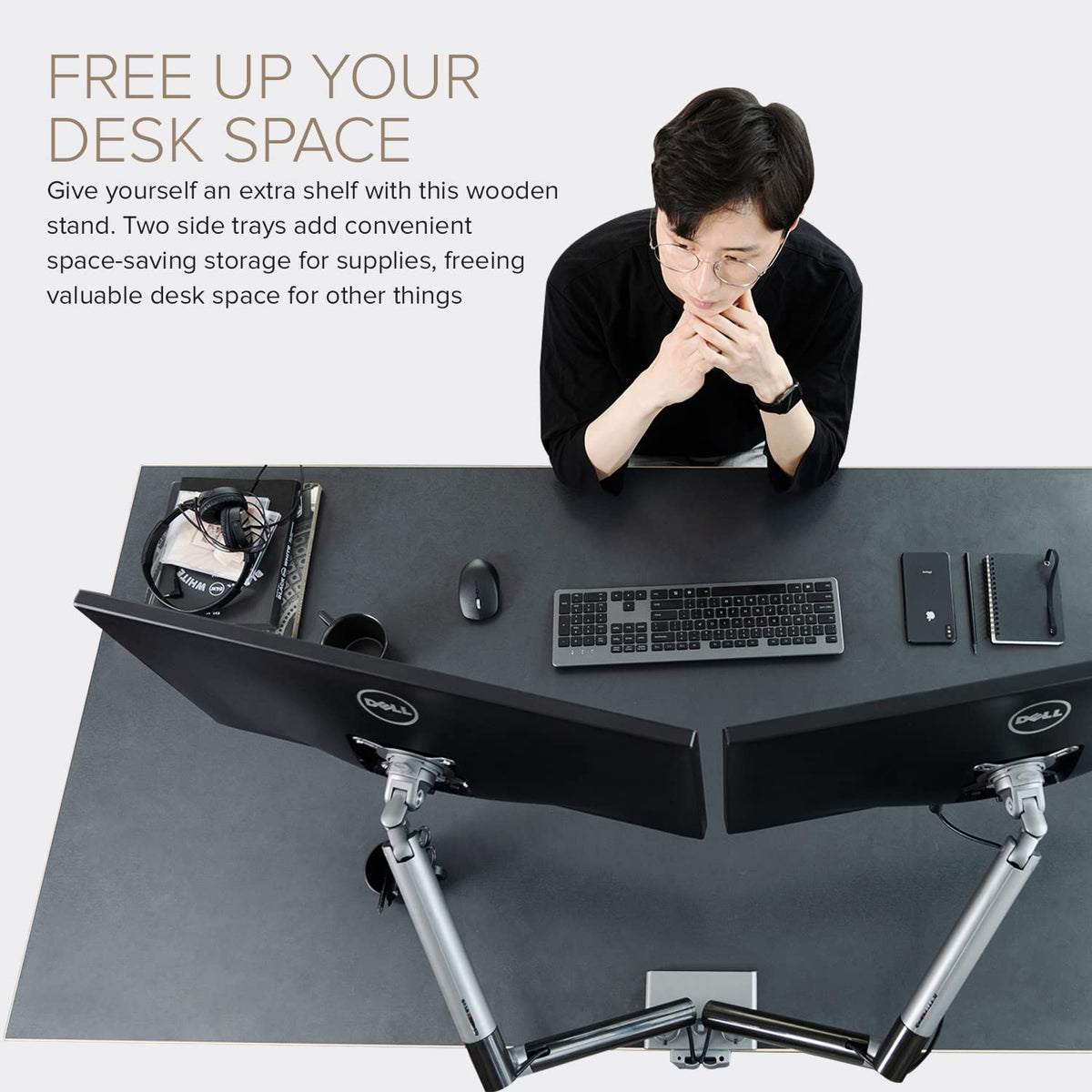 Free Up Space And Make Working From Two Computer Monitors A More Comfortable Experience With The Eyes 12 Dual From Pout. These Adjustable Dual Monitor Arms Will Allow You To Lift Two Computer Monitors Above Your Desk Or Table At A Level Of Elevation Much Kinder To Your Eyes And Posture, While Simultaneously Opening Up The Space On The Desk Itself For A Cleaner, Less Cluttered Look And Feel. The Arms Are Adjustable To The Heights And Positions That Best Suit You, While Also Featuring Swivel, Tilt, And Rotational Capacities Along Themselves, So You Can Angle Each Screen In The Way That Works For You At The Time. With A Reliable Clamp And Grommet Base, Along With Sturdy, Durable Aluminum Construction, You Can Trust That Each Arm Will Hold Monitors Up To 19.8Lbs In Weight And 32 Inches In Size With Ease. Made With A Minimalistic, Sleek, And Suave Style, This Dual Metal Monitor Mount Will Fit Perfectly Into Any Office Or Home Setup, Bringing A Modern And Cool Touch To Your Workspace. Work At Your Desk In True Comfort And Unmatchable Style With The Eyes 12 Dual From Pout.