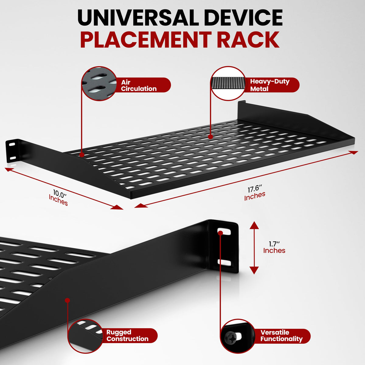 Pyle Model : Plrstn14U1U Server Rack Shelf Mount Tray1U Server Rack Shelf, Universal Device Server Rack Mounting Trayfeatures: Universal Device Placement Rack Works With Both Non-Rack & Half-Rack Equipment Punch-Out Shelf Bottom Allows For Ventilation Promotes Safety & Air Circulation Rugged & Heavy-Duty Metal Construction Perfect For On-Stage Or In-Studio Use Compatible With All 19 Server Rackstechnical Specs: Construction Material: Steel Compatible Rack Shelf Size: 1U Maximum Weight Load Capacity: 110 Lbs. Shelf Tray Size (L X W): 17.6 X 10.0 Total Size: (L X W X H): 19.0 X 10.0 X 1.7 (Including Mounting Brackets)The 1U Server Rack Shelf Is Used For Electronics, Musical Equipment, Recording Studios And More - Universal Device Placement Rack - Works With Both Non-Rack & Half-Rack Equipment - Punch-Out Shelf Bottom Allows For Ventilation - Promotes Safety & Air Circulation - Rugged & Heavy-Duty Metal Construction - Perfect For On-Stage Or In-Studio Use - Compatible With All 19 Server Racks - Construction Material: Steel - Compatible Rack Shelf Size: 1U - Maximum Weight Load Capacity: 110 Lbs. - Shelf Tray Size (L X W): 17.6 X 10.0 - Total Size: (L X W X H): 19.0 X 10.0 X 1.7 (Including Mounting Brackets) - Unit Weight: 2.87 Lbs. - Model: Plrstn14U.
