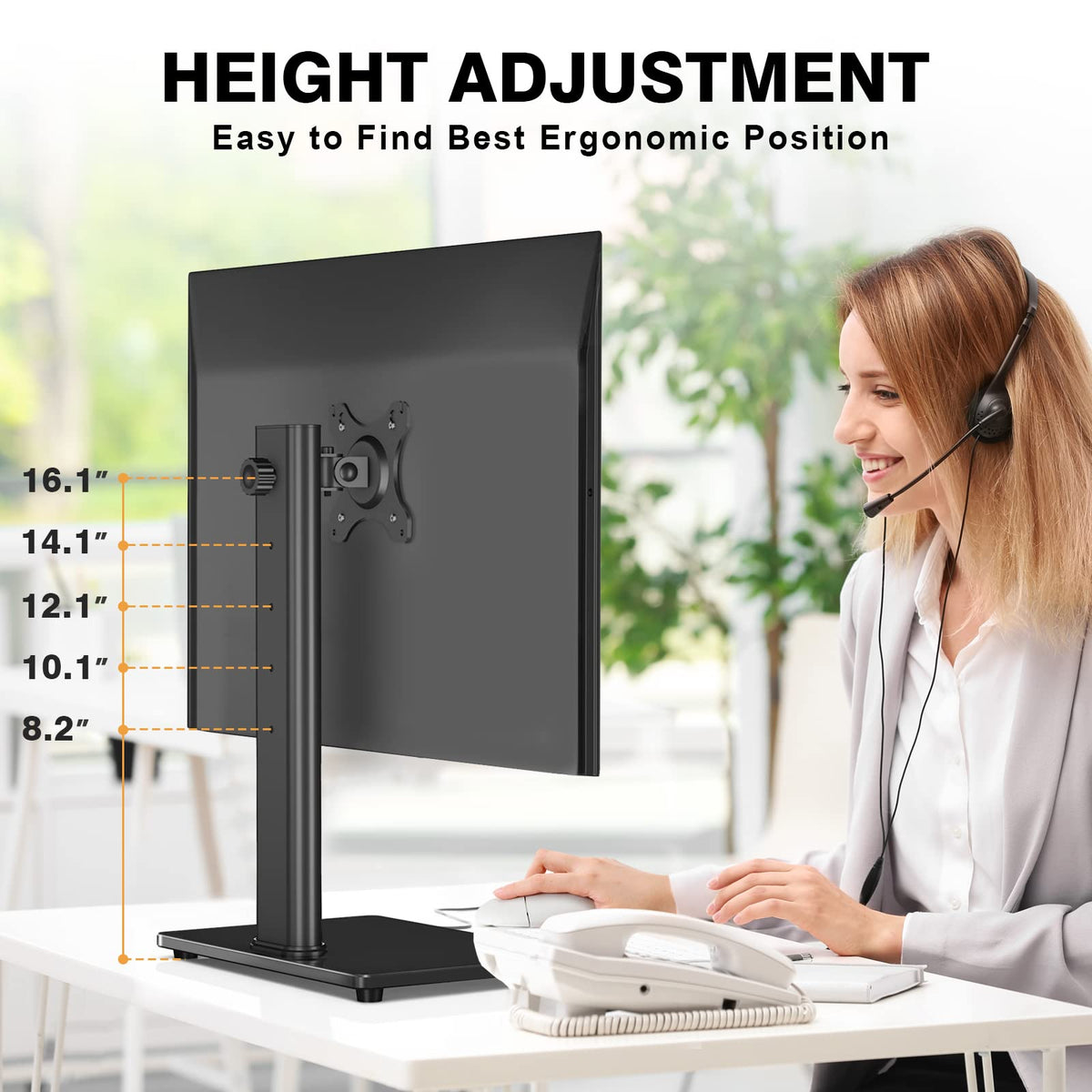 ?Brand:Tavr Furniture Monitor Stand Mount ?Specifications: -- Swivel: 70 -- Tilt: ?15/+10 -- Rotation: 360 -- Height Adjustable: 8.2''-16.1'' -- Single Monitor Mount Weight Capacity: 44 Lbs -- Product Dimensions: 11.8(L) X 7.9(W) X8.2-16.1(H) Inches -- Recommend Monitor Size: 13-32 Inches -- Support Vesa Size: 75(W)Mm X 75(H)Mm Or 100(W)Mm X 100(H)Mm -- Carton: 17(W)X8(D)X2.4(H) Inches -- Material: Glass,Metal -- Color: Black ?Description: This Computer Monitor Mount Comes With 8Mm Black Tempered Glass Base That Connects To A Metal Pole Which Provides Stable Support For Your Monitors And Can Hold Up To 44 Lbs, Support Most 13''-32'' Led Lcd Screens, Vesa Mounting Hole Patterns: 100X100Mm/ 75X75Mm. Computer Riser Swivel 70 Degrees Left Or Right And Height Adjustable Provide Optimum Viewing Angles In Different Positions, You Can Also Fix The Mount To Keep The Single Viewing Angle As You Like. -15To 10 Tilt, 360 Rotation, Give You Work More Freedom,And Release The Pressure On Your Neck And Shoulders. Overall The Portable Monitor Stand Is Great Quality, Strong, Sturdy And Nice Looking. ?Package Includes: -- 1 X Adjustable Monitor Stand -- 1 X Install Instruction-- 12 X M4 Screws -- 12 X M5 Screws ? Please Note: Our Product Are Guaranteed For 5 Years. If You Have Any Questions, Please Feel Free To Contact Us By Email Or Phone At The Instruction Manual. We Have Customer Service In The United States. We Will Reply To You Within 12 Hours.