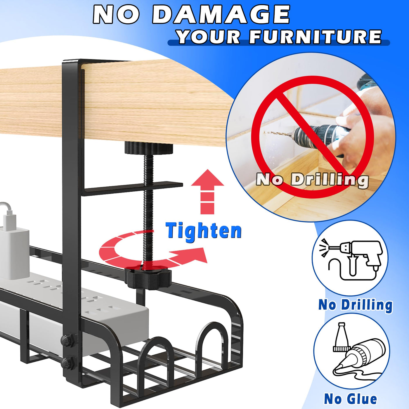 Q: How do I install the Sleclean Under Desk Cable Management Tray?A: The Sleclean Under Desk Cable Management Tray is designed for easy installation without drilling. Simply clamp it to your desk frame using the upgraded long arm clamps. Rotate the black knob by hand to secure it tightly. The soft anti-scratch pads on the clamps will protect your desk from any damage.