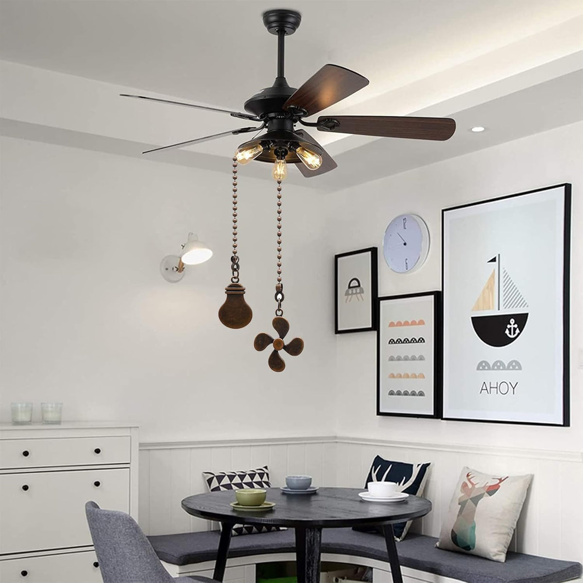 Q: What designs do the pull chains feature?A: This product includes two unique designs: one fan-shaped pull chain extension and one lightbulb-shaped pull chain extender. These distinctive designs help you easily identify which switch controls your fan or light.