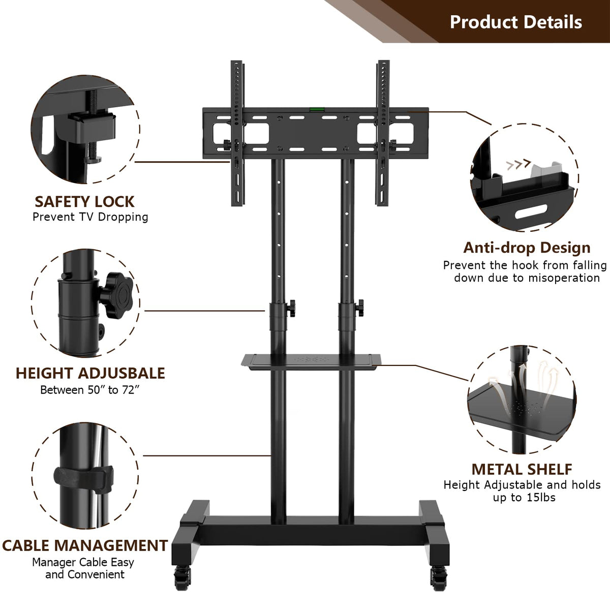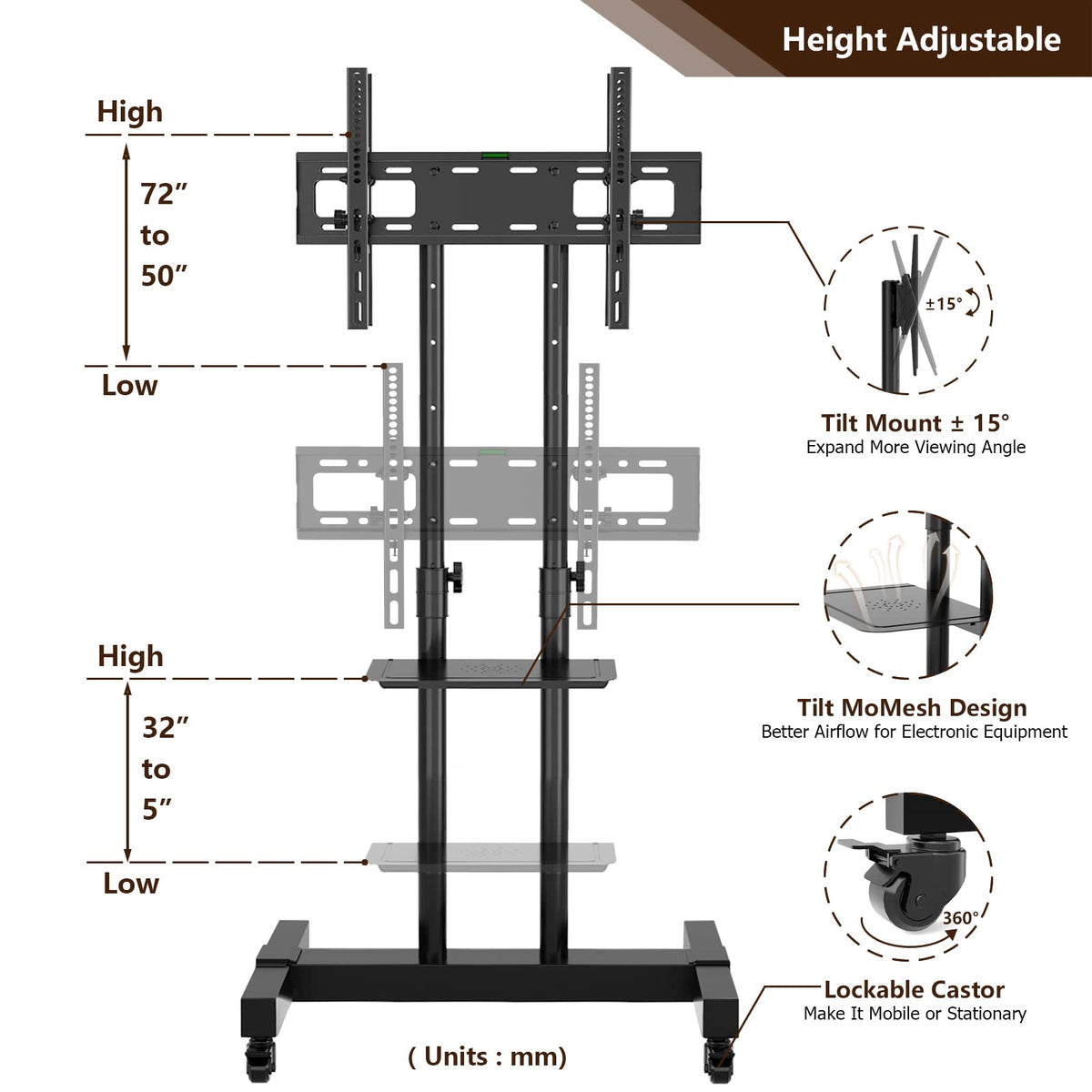 ?Brand:Tavr Furniture ?Specifications: -- Product Dimensions: 30(L) X 24 (W)X (50-72) (H) -- Carton: 39.6(L) X15.7(W) X 5.2(H) Inch -- Mount Weight Capacity: 110 Lbs -- Support Vesa Size: 100(W)Mm X 100(H)Mm Up To 600(W)Mm X 400(H)Mm -- Recommend Tv Size: 32-70 Inches -- Material: Metal -- Color: Black ?Description: This Mobile Tv Stand Has 2 Mounting Brackets For Display Flat/Curved Screen Monitors Between 32 And 70'' And Up To 110 Lbs, It Is Absolutely Sleek And Looks Great! Its Made Of Heavy Duty Material For The Affordable Price. Easy Introductions To Read And Assemble Within 30 Minutes. You Don'T Need To Mount The Tv On The Wall, This Stand Is The Perfect Solution. Heavy-Duty Locking Casters On Front Side Wheels To Make The Tv Stand Cart Stationary Or Mobile When Desired, Easy To Roll Around, Change Tv'S Viewing Angle And Even To Move This From Room To Room. Rolling Tv Stand Height Adjustable From 50 To 72 And The Mounting Bracket Can Be Tilted Up And Down By 15 Degrees To Provide The Optical Viewing Angle Any Time.Furthermore, Height Adjustable Metal Av Device Tray Shelf Offers More Space To Hold A/V Equipment Like Games Monitor, Tablets, Cable Box, Laptops Etc. Our Universal Tv Stand Is Ideal Use For Any Location In Offices, Homes, Schools, Boardrooms, Hotels, Airports, Lobbies, Hospitals, Laboratories, Churches, Shopping Malls And More. It Is A Great Choice For Video Conferencing Or Doing Presentations At Trade Shows, Business, Pc Gaming Or Entertainment.Stable, Easy To Move, & Sharp Looking. ?Package Includes: -- 1 X Universal Mobile Tv Cart -- 1 X Install Instruction Should You Have Any Concerns, Our Friendly Customer Support Team Will Be Happy To Help You And Reply You In 12 Hours.