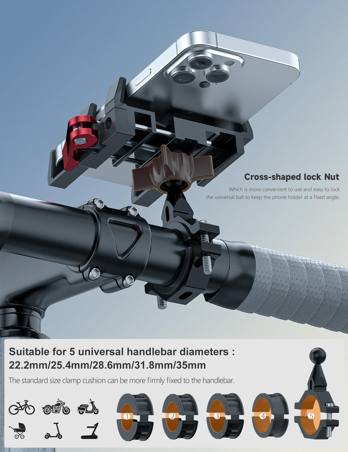 Product Features 1. This Phone Holder Use An Eccentric Cam Clamping Mechanism To Clamp The Phone. Compared With The Phone Holder Of The Traditional Structure, Its Structure Is Simpler, Firmer And More Reliable,The Operation Is Also Easier And Quicker. 2.It Adopts A U-Shaped 6-Hook Structure, Which Clamps Both Sides Of The Phone And Holds The Bottom Ofthe Phone. The Clamping Is Firm And Will Not Blockthe Camera And Buttons Of The Phone. 3.The Holder Is Connected To The Base Through A Universal Ball, Which Can Rotate 360. The Lock Nut Adopts Across-Shaped Structure , Which Is More Convenientto Use. It Is Easy To Lock The Universal Ball To Keepthe Phone Holder At A Fixed Angle. 4. The Holder And Base Is Made Of Aluminum Alloy, Which Is Sturdy And Durable , And Also Has Goodaging Resistance (Don'T Worry About Ultravioletrays). It Is Much Better Than Abs Plastic Material. 5.It Has Better Compatibility , Suitable For Phones Ofmore Sizes. It Is Also Equipped With Four Different Standard Nylon Washers, Suitable For More Typesof Bicycles, Motorcycles Or Electric Vehicles.